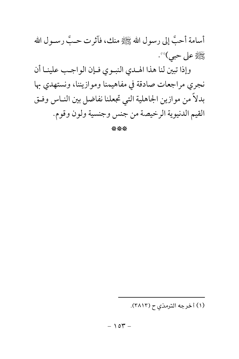 وإذا تبين لنا هذا الهدي النبوي فإن الواجب علينا أن نجري مراجعات صادقة في مفاهيمنا وموازيننا، ونستهدي بها بدلاً من موازين الجاهلية التي تجعلنا نفاضل بين الناس وفق القيم الدنيوية الرخيصة من جنس وجنسية ولون وقوم.