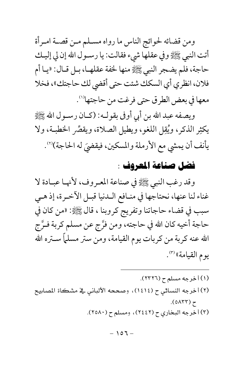وقد رغب النبي - صلى الله عليه وسلم - في صناعة المعروف، لأنها عبادة لا غناء لنا عنها، نحتاجها في منافع الدنيا قبل الآخرة، إذ هي سبب في قضاء حاجاتنا وتفريج كروبنا، قال - صلى الله عليه وسلم -: «من كان في حاجة أخيه كان الله في حاجته، ومن فرَّج عن مسلم كربة فرَّج الله عنه كربة من كربات يوم القيامة، ومن ستر مسلماً ستره الله يوم القيامة» (¬3).