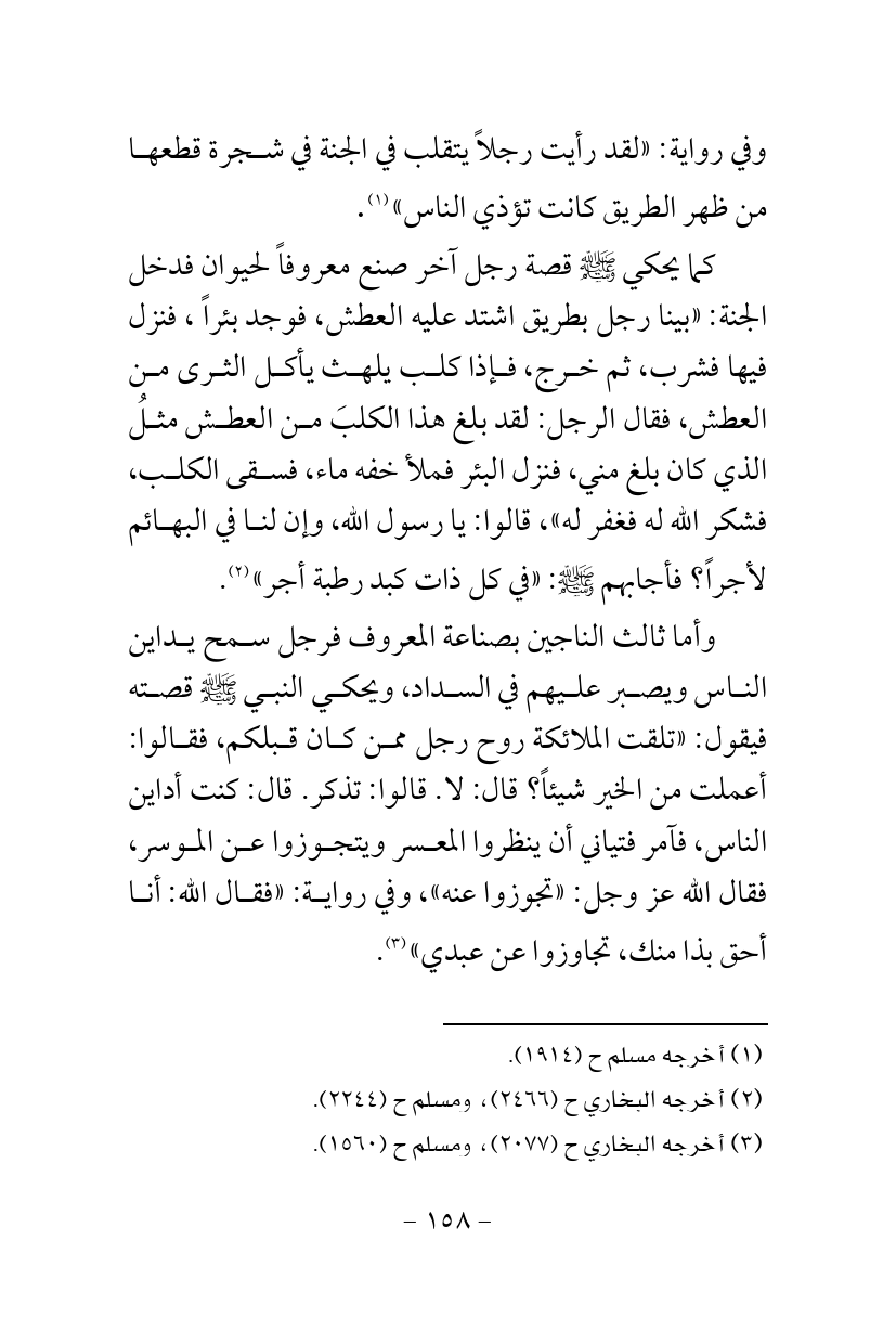 كما يحكي - صلى الله عليه وسلم - قصة رجل آخر صنع معروفاً لحيوان فدخل الجنة: «بينا رجل بطريق اشتد عليه العطش، فوجد بئراً، فنزل فيها فشرب، ثم خرج، فإذا كلب يلهث يأكل الثرى من العطش، فقال الرجل: لقد بلغ هذا الكلبَ من العطش مثلُ الذي كان بلغ مني، فنزل البئر فملأ خفه ماء، فسقى الكلب، فشكر الله له فغفر له»، قالوا: يا رسول الله، وإن لنا في البهائم لأجراً؟ فأجابهم - صلى الله عليه وسلم -: «في كل ذات كبد رطبة أجر» (¬2).