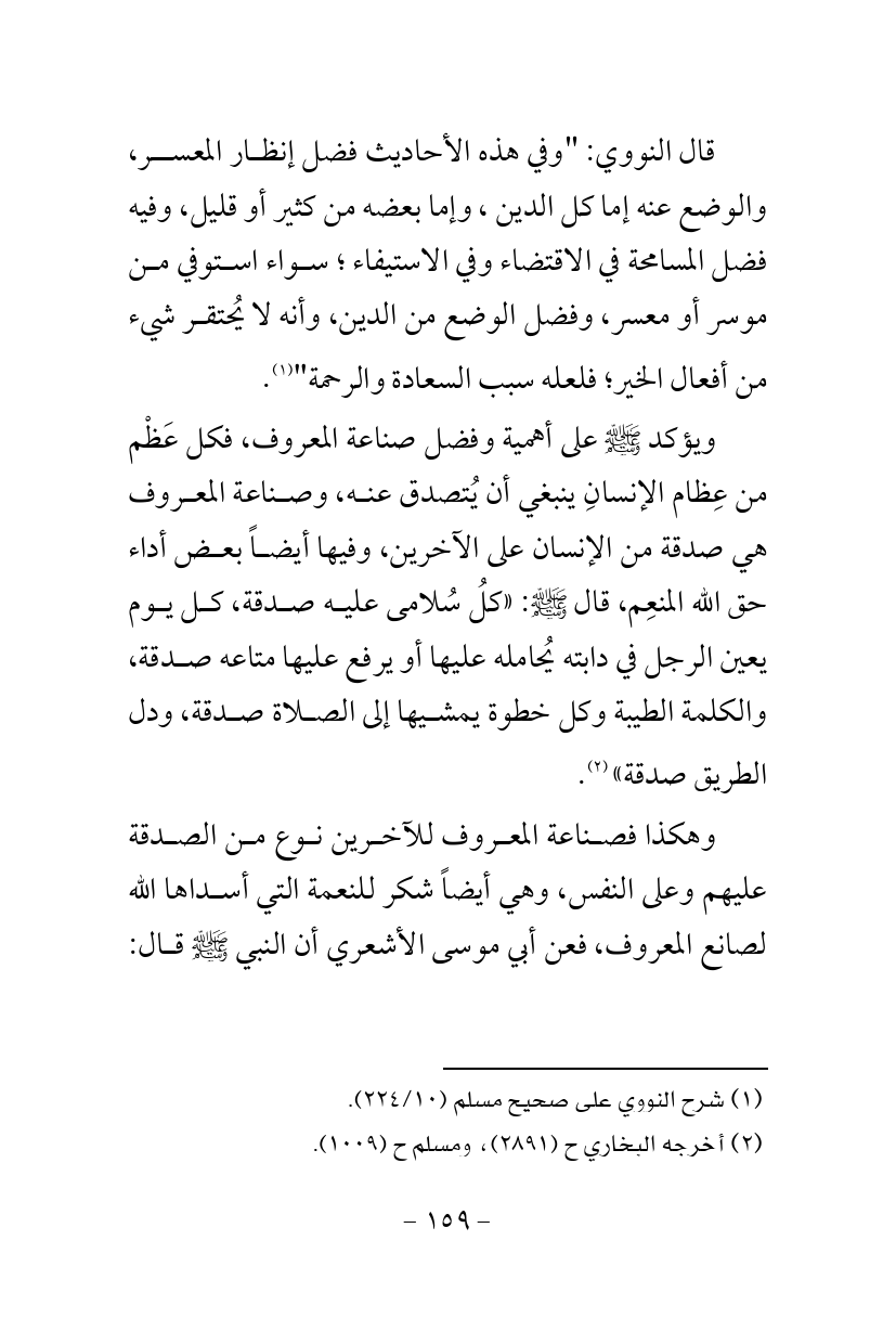 ويؤكد - صلى الله عليه وسلم - على أهمية وفضل صناعة المعروف، فكل عَظْم من عِظام الإنسانِ ينبغي أن يُتصدق عنه، وصناعة المعروف هي صدقة من الإنسان على الآخرين، وفيها أيضاً بعض أداء حق الله المنعِم، قال - صلى الله عليه وسلم -: «كلُ سُلامى عليه صدقة، كل يوم يعين الرجل في دابته يُحامله عليها أو يرفع عليها متاعه صدقة، والكلمة الطيبة وكل خطوة يمشيها إلى الصلاة صدقة، ودل الطريق صدقة» (¬2).