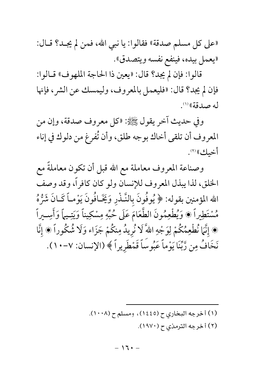 وصناعة المعروف معاملة مع الله قبل أن تكون معاملةً مع الخلق، لذا يبذل المعروف للإنسان ولو كان كافراً، وقد وصف الله المؤمنين بقوله: {يُوفُونَ بِالنَّذْرِ وَيَخَافُونَ يَوْماً كَانَ شَرُّهُ مُسْتَطِيراً وَيُطْعِمُونَ الطَّعَامَ عَلَى حُبِّهِ مِسْكِيناً وَيَتِيماً وَأَسِيراً إِنَّمَا نُطْعِمُكُمْ لِوَجْهِ اللَّهِ لَا نُرِيدُ مِنكُمْ جَزَاء وَلَا شُكُوراً إِنَّا نَخَافُ مِن رَّبِّنَا يَوْماً عَبُوساً قَمْطَرِيراً} (الإنسان: 7 - 10).