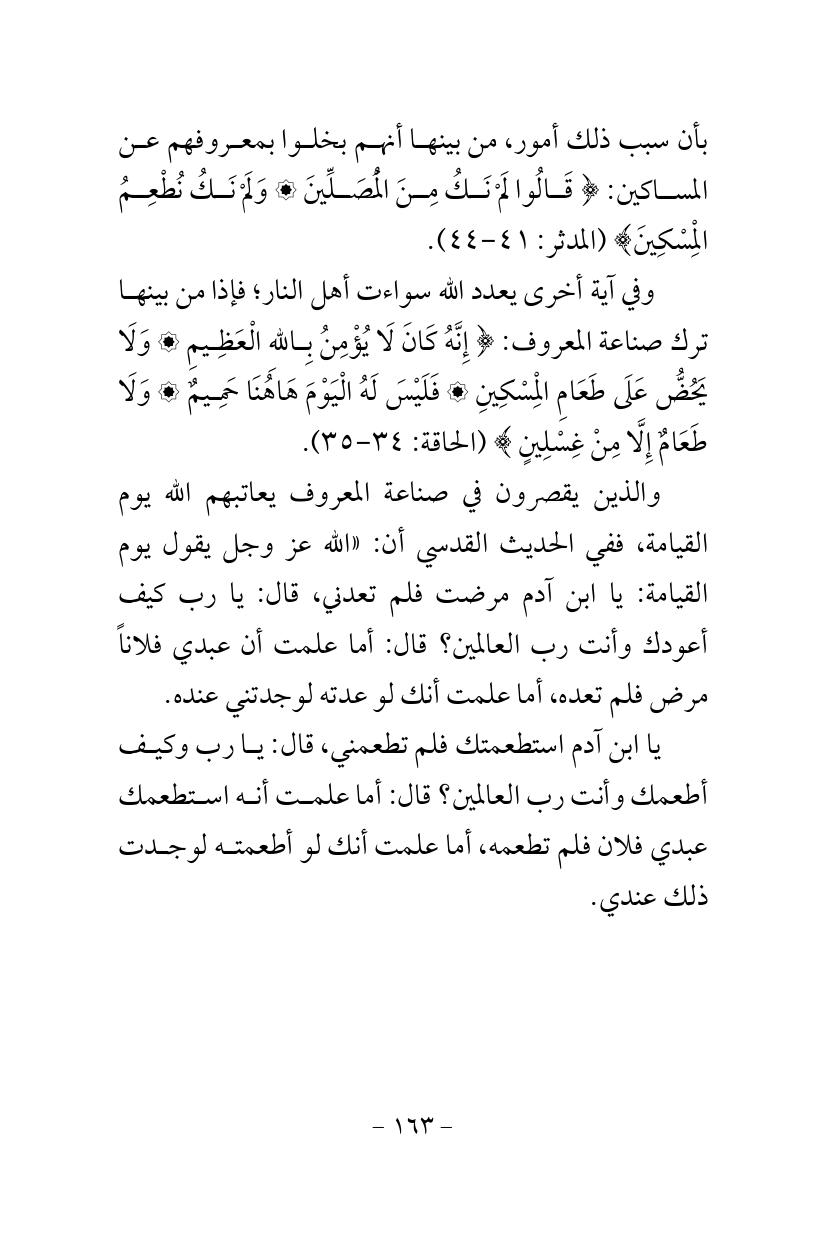 وفي آية أخرى يعدد الله سواءت أهل النار؛ فإذا من بينها ترك صناعة المعروف: {إِنَّهُ كَانَ لَا يُؤْمِنُ بِاللهِ الْعَظِيمِ وَلَا يَحُضُّ عَلَى طَعَامِ الْمِسْكِينِ فَلَيْسَ لَهُ الْيَوْمَ هَاهُنَا حَمِيمٌ وَلَا طَعَامٌ إِلَّا مِنْ غِسْلِينٍ} (الحاقة: 34 - 35).