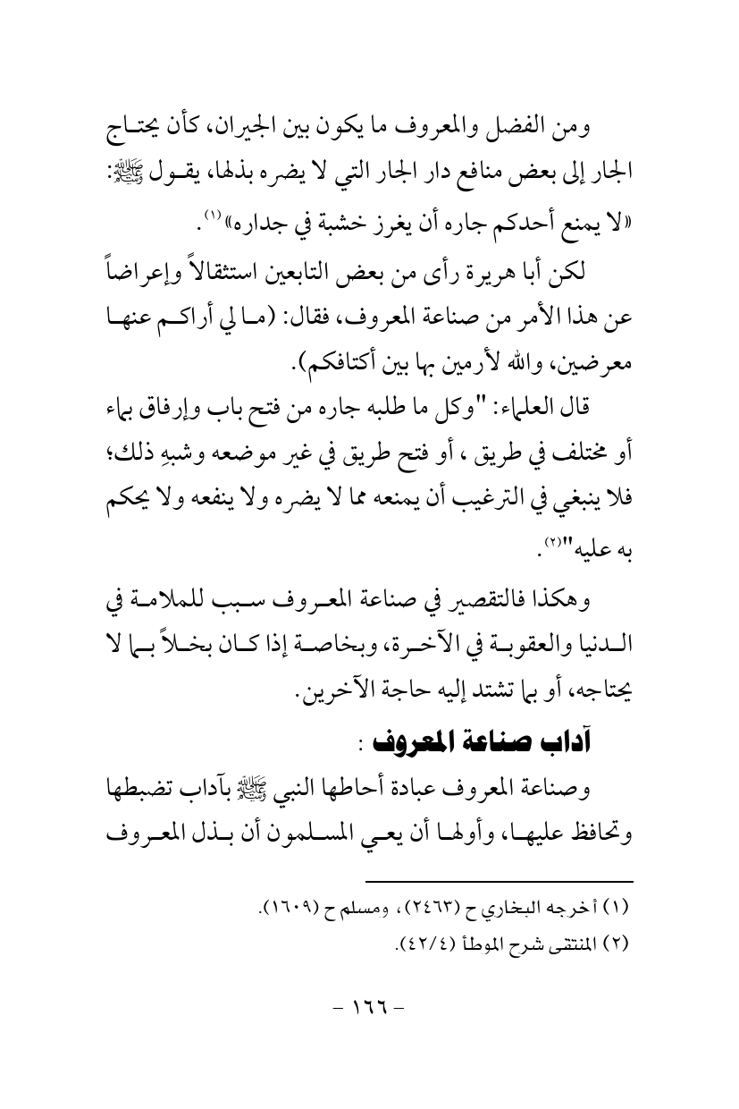 ومن الفضل والمعروف ما يكون بين الجيران، كأن يحتاج الجار إلى بعض منافع دار الجار التي لا يضره بذلها، يقول - صلى الله عليه وسلم -: «لا يمنع أحدكم جاره أن يغرز خشبة في جداره» (¬1).