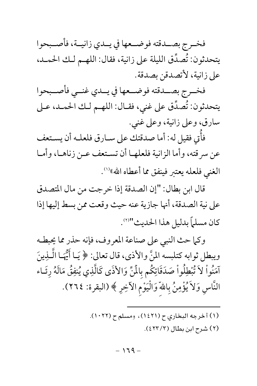 فأُتي فقيل له: أما صدقتك على سارق فلعله أن يستعف عن سرقته، وأما الزانية فلعلها أن تستعف عن زناها، وأما الغني فلعله يعتبر فينفق مما أعطاه الله» (¬1).
