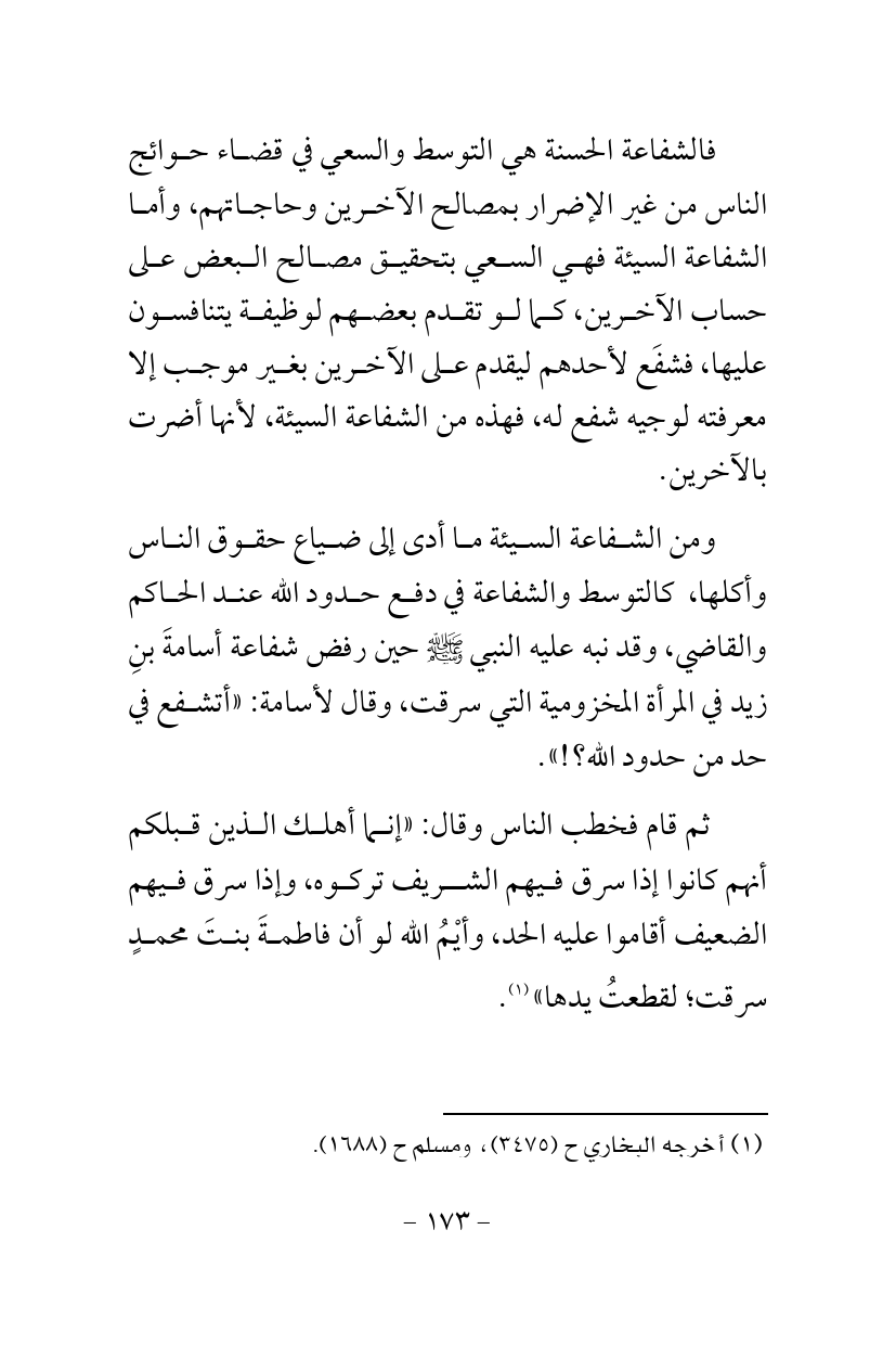 ومن الشفاعة السيئة ما أدى إلى ضياع حقوق الناس وأكلها، كالتوسط والشفاعة في دفع حدود الله عند الحاكم والقاضي، وقد نبه عليه النبي - صلى الله عليه وسلم - حين رفض شفاعة أسامةَ بنِ زيد في المرأة المخزومية التي سرقت، وقال لأسامة: «أتشفع في حد من حدود الله؟!».