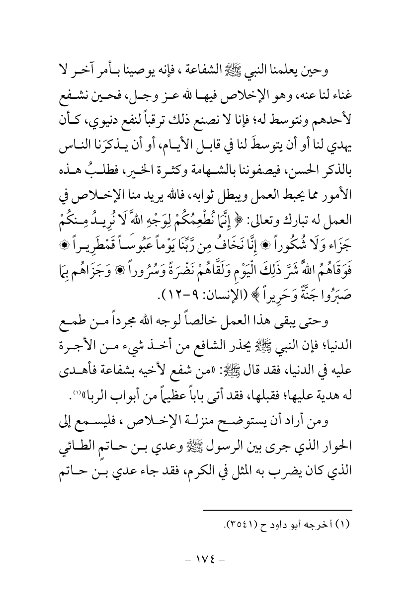 ومن أراد أن يستوضح منزلة الإخلاص، فليسمع إلى الحوار الذي جرى بين الرسول - صلى الله عليه وسلم - وعدي بن حاتمٍ الطائي الذي كان يضرب به المثل في الكرم، فقد جاء عدي بن حاتم