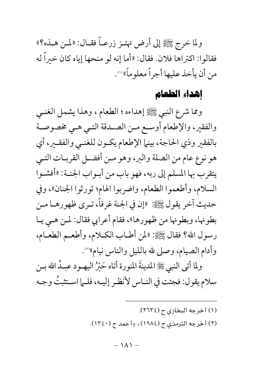 ومما شرع النبي - صلى الله عليه وسلم - إهداءه؛ الطعام، وهذا يشمل الغني والفقير، والإطعام أوسع من الصدقة التي هي مخصوصة بالفقير وذي الحاجة، بينما الإطعام يكون للغني والفقير، أي هو نوع عام من الصلة والبر، وهو من أفضل القربات التي يتقرب بها المسلم إلى ربه، فهو باب من أبواب الجنة: «أفشوا السلام، وأطعموا الطعام، واضربوا الهام؛ تورثوا الجنان»، وفي حديث آخر يقول - صلى الله عليه وسلم -: «إن في الجنة غرفاً، ترى ظهورها من بطونها، وبطونها من ظهورها»، فقام أعرابي فقال: لمن هي يا رسول الله؟ فقال - صلى الله عليه وسلم -: «لمن أطاب الكلام، وأطعم الطعام، وأدام الصيام، وصلى لله بالليل والناس نيام» (¬2).