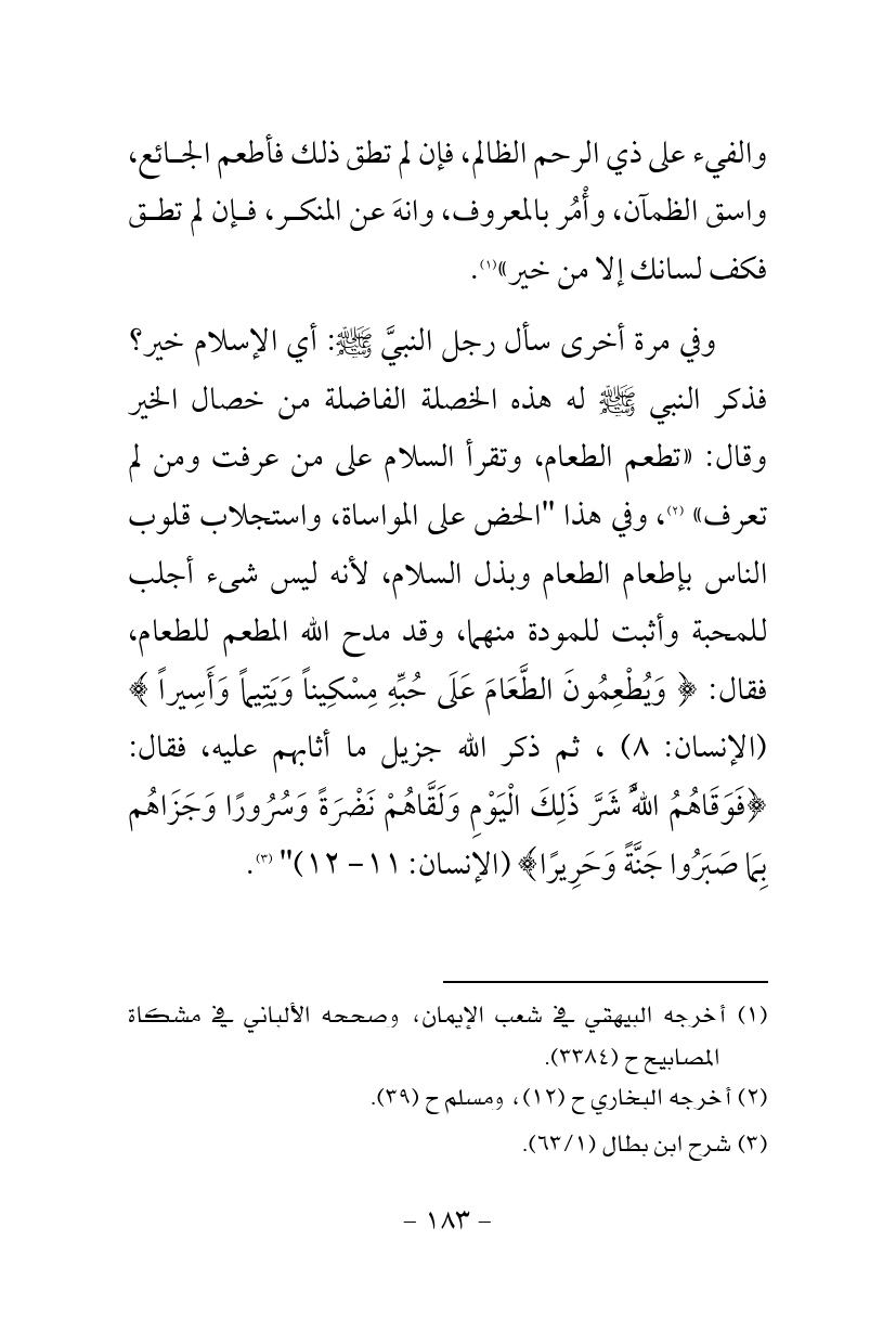 وفي مرة أخرى سأل رجل النبيَّ - صلى الله عليه وسلم -: أي الإسلام خير؟ فذكر النبي - صلى الله عليه وسلم - له هذه الخصلة الفاضلة من خصال الخير وقال: «تطعم الطعام، وتقرأ السلام على من عرفت ومن لم تعرف» (¬2)، وفي هذا "الحض على المواساة، واستجلاب قلوب الناس بإطعام الطعام وبذل السلام، لأنه ليس شىء أجلب للمحبة وأثبت للمودة منهما، وقد مدح الله المطعم للطعام، فقال: {وَيُطْعِمُونَ الطَّعَامَ عَلَى حُبِّهِ مِسْكِيناً وَيَتِيماً وَأَسِيراً} (الإنسان: 8)، ثم ذكر الله جزيل ما أثابهم عليه، فقال: {فَوَقَاهُمُ اللَّهُ شَرَّ ذَلِكَ الْيَوْمِ وَلَقَّاهُمْ نَضْرَةً وَسُرُورًا وَجَزَاهُم بِمَا صَبَرُوا جَنَّةً وَحَرِيرًا} (الإنسان: 11 - 12) " (¬3).