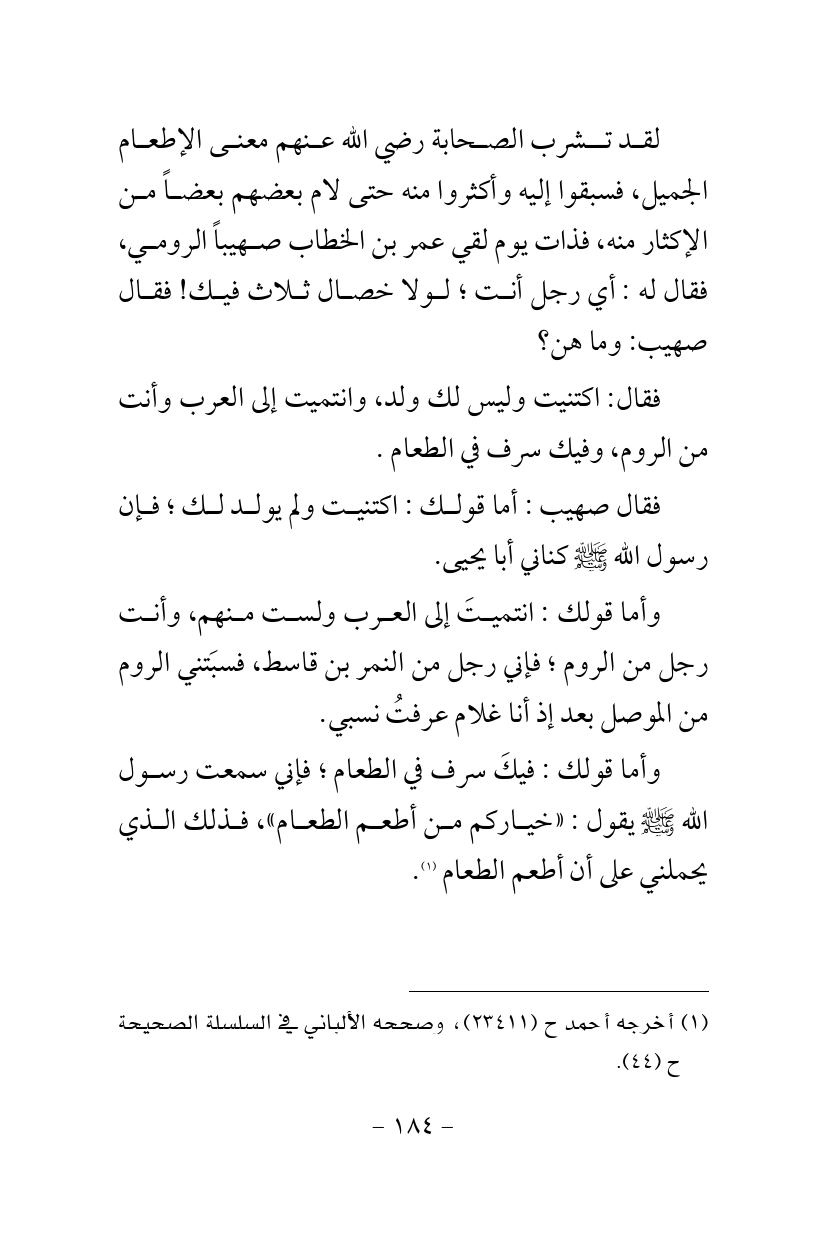 لقد تشرب الصحابة رضي الله عنهم معنى الإطعام الجميل، فسبقوا إليه وأكثروا منه حتى لام بعضهم بعضاً من الإكثار منه، فذات يوم لقي عمر بن الخطاب صهيباً الرومي، فقال له: أي رجل أنت؛ لولا خصال ثلاث فيك! فقال صهيب: وما هن؟