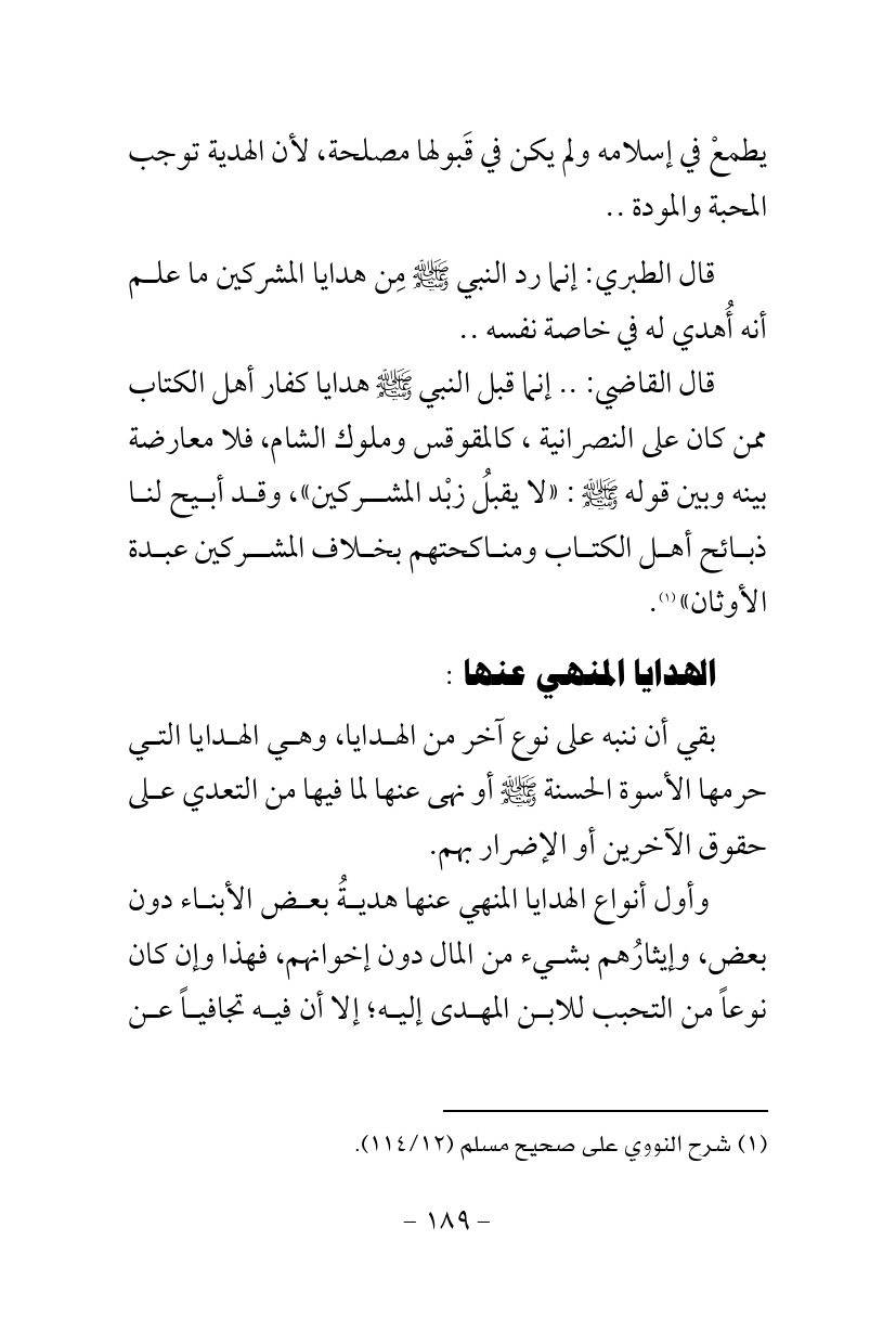 قال القاضي: .. إنما قبل النبي - صلى الله عليه وسلم - هدايا كفار أهل الكتاب ممن كان على النصرانية، كالمقوقس وملوك الشام، فلا معارضة بينه وبين قوله - صلى الله عليه وسلم -: «لا يقبلُ زبْد المشركين»، وقد أبيح لنا ذبائح أهل الكتاب ومناكحتهم بخلاف المشركين عبدة الأوثان» (¬1).