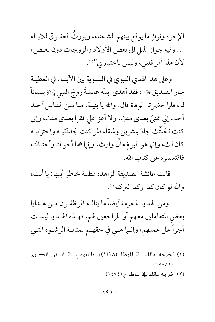 وعلى هذا الهدي النبوي في التسوية بين الأبناء في العطية سار الصديق - رضي الله عنه -، فقد أهدى ابنتَه عائشةَ زوجَ النبي - صلى الله عليه وسلم - بستاناً له، فلما حضرته الوفاة قال: والله يا بنية، ما من الناس أحد أحب إلي غنىً بعدي منكِ، ولا أعز علي فقراً بعدي منك، وإني كنت نحَلْتُك جادَ عِشرين وسْقاً، فلو كنت جَددْتيه واحتزتيه كان لك، وإنما هو اليومَ مالُ وارث، وإنما هما أخواك وأختاك، فاقتسموه على كتاب الله.