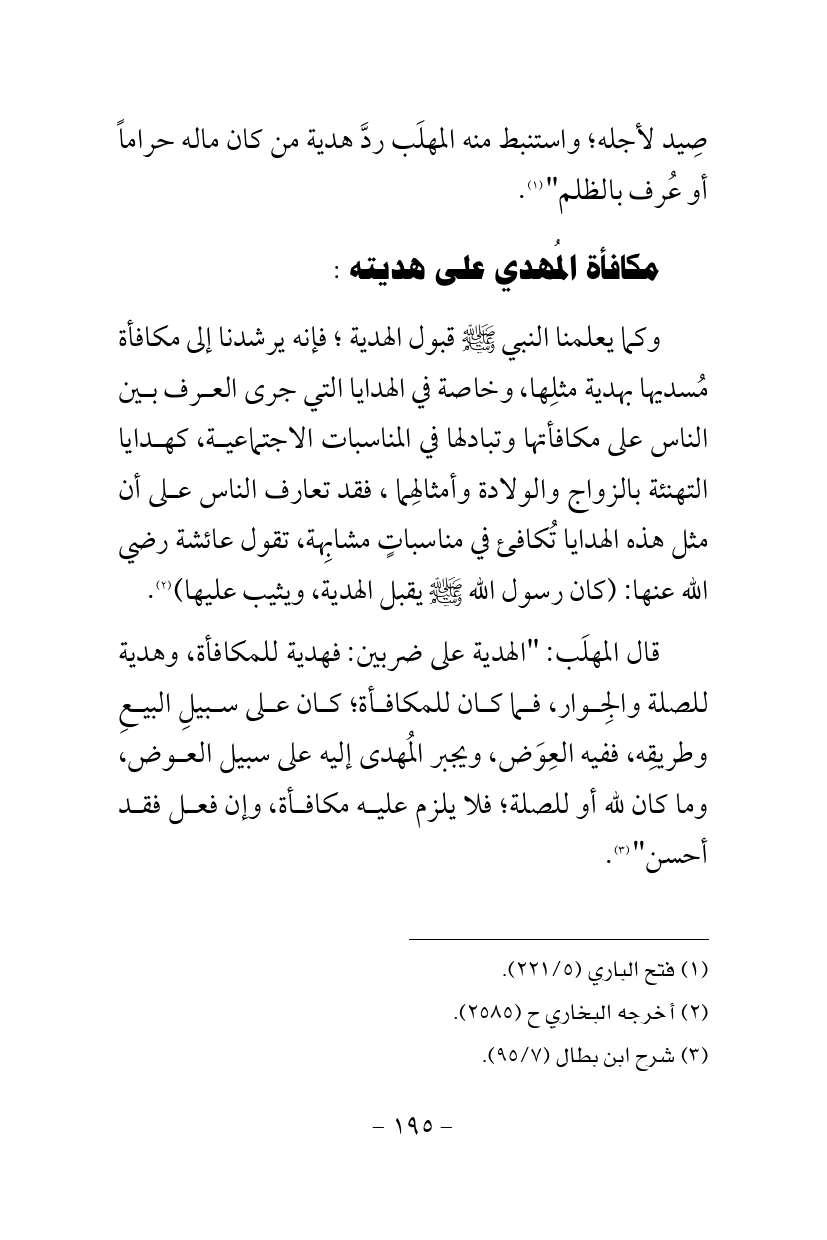 قال المهلَب: "الهدية على ضربين: فهدية للمكافأة، وهدية للصلة والجِوار، فما كان للمكافأة؛ كان على سبيلِ البيعِ وطريقِه، ففيه العِوَض، ويجبر المُهدى إليه على سبيل العوض، وما كان لله أو للصلة؛ فلا يلزم عليه مكافأة، وإن فعل فقد أحسن" (¬3).