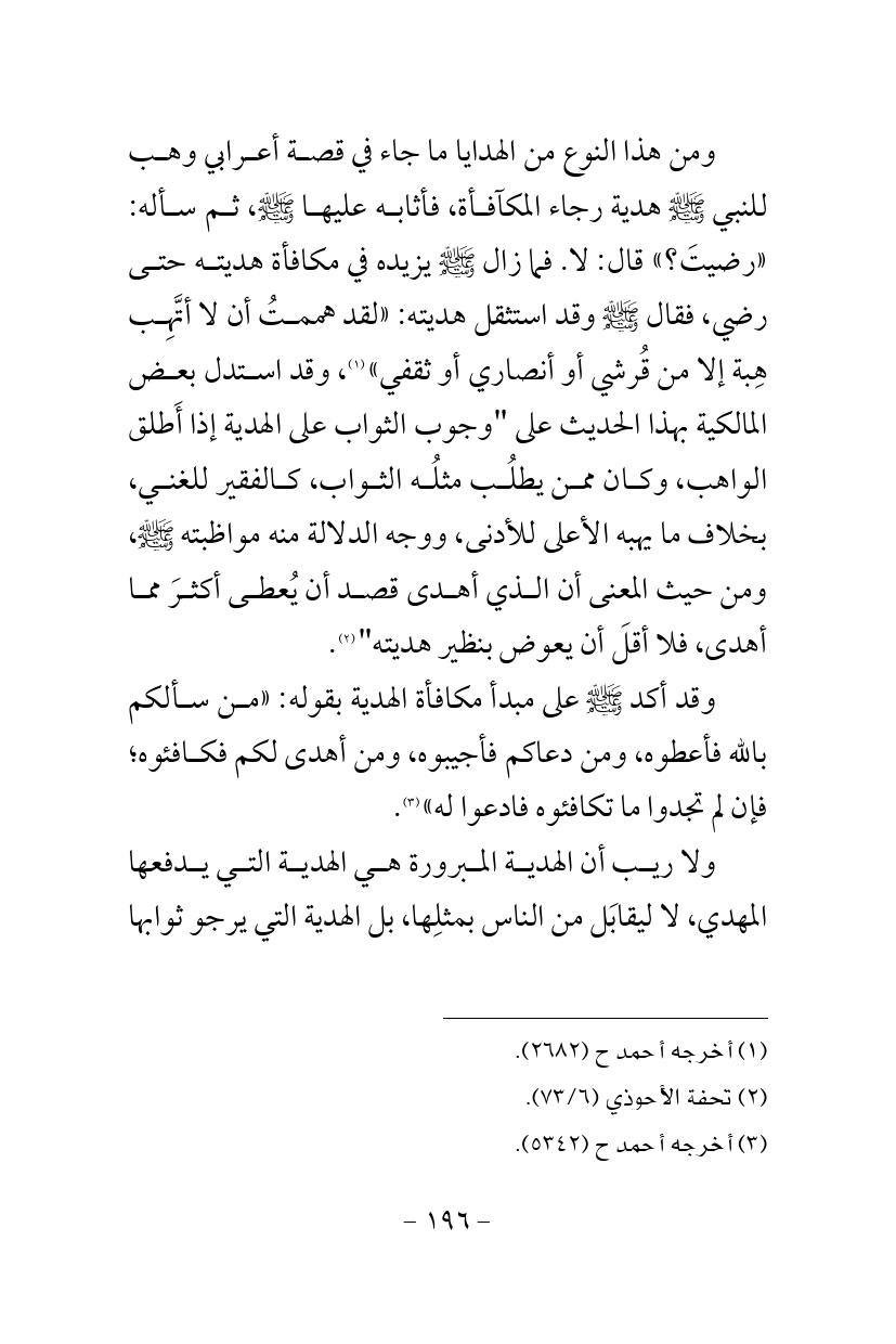 وقد أكد - صلى الله عليه وسلم - على مبدأ مكافأة الهدية بقوله: «من سألكم بالله فأعطوه، ومن دعاكم فأجيبوه، ومن أهدى لكم فكافئوه؛ فإن لم تجدوا ما تكافئوه فادعوا له» (¬3).