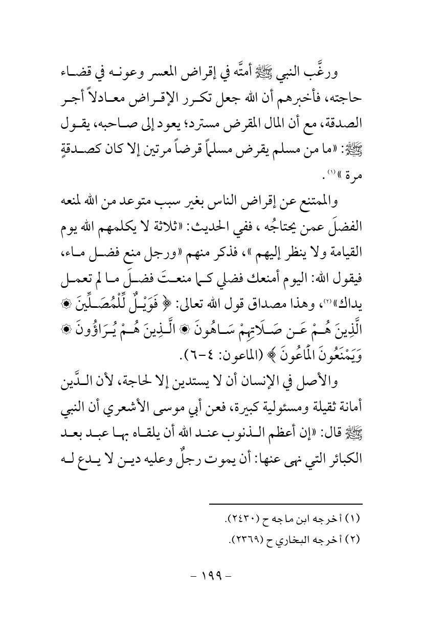 والممتنع عن إقراض الناس بغير سبب متوعد من الله لمنعه الفضلَ عمن يحتاجُه، ففي الحديث: «ثلاثة لا يكلمهم الله يوم القيامة ولا ينظر إليهم»، فذكر منهم «ورجل منع فضل ماء، فيقول الله: اليوم أمنعك فضلي كما منعتَ فضلَ ما لم تعمل يداك» (¬2)، وهذا مصداق قول الله تعالى: {فَوَيْلٌ لِّلْمُصَلِّينَ الَّذِينَ هُمْ عَن صَلَاتِهِمْ سَاهُونَ الَّذِينَ هُمْ يُرَاؤُونَ وَيَمْنَعُونَ الْمَاعُونَ} (الماعون: 4 - 6).