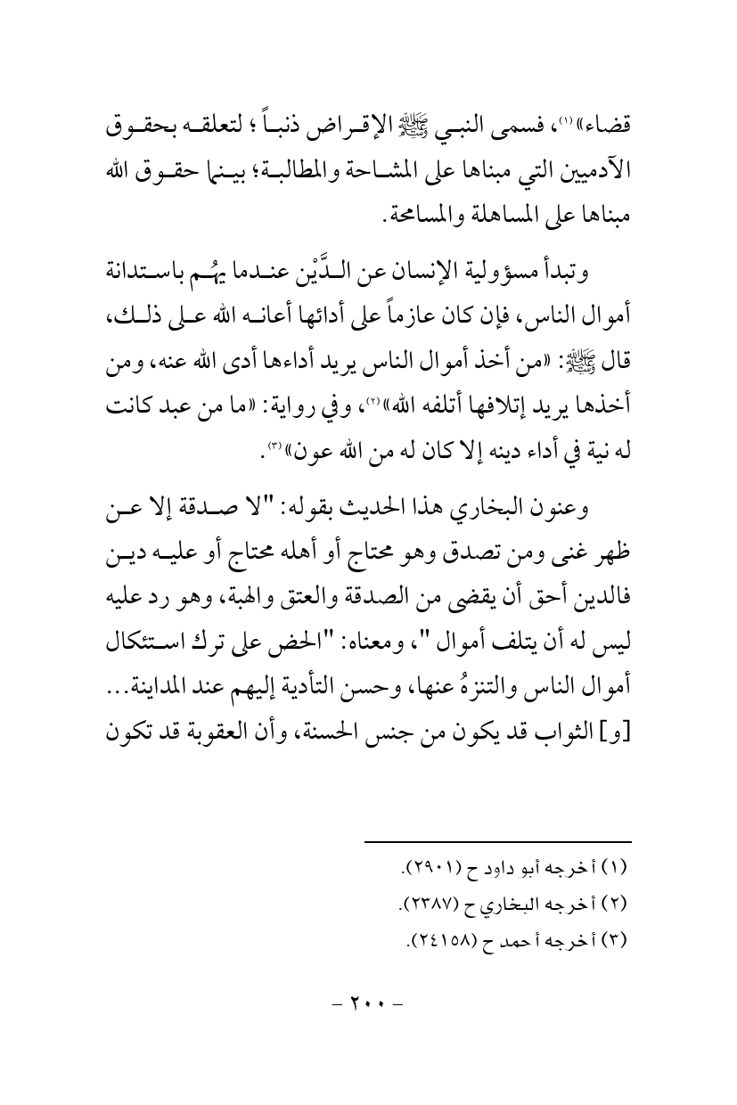وتبدأ مسؤولية الإنسان عن الدَّيْن عندما يهُم باستدانة أموال الناس، فإن كان عازماً على أدائها أعانه الله على ذلك، قال - صلى الله عليه وسلم -: «من أخذ أموال الناس يريد أداءها أدى الله عنه، ومن أخذها يريد إتلافها أتلفه الله» (¬2)، وفي رواية: «ما من عبد كانت له نية في أداء دينه إلا كان له من الله عون» (¬3).