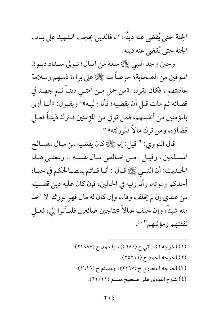 قال النووي: " قيل: إنه - صلى الله عليه وسلم - كان يقضيه من مال مصالح المسلمين، وقيل: من خالص مال نفسه .. ومعنى هذا الحديث: أن النبي - صلى الله عليه وسلم - قال: أنا قائم بمصالحكم في حياة أحدكم وموته، وأنا وليه في الحالين، فإن كان عليه دين قضيته من عندي إن لم يخلف وفاء، وإن كان له مال فهو لورثته لا آخذ منه شيئاً، وإن خلف عيالاً محتاجين ضائعين فليأتوا إلي، فعلي نفقتهم ومؤنتهم" (¬4).