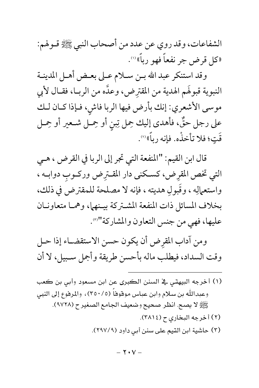 الشفاعات، وقد روي عن عدد من أصحاب النبي - صلى الله عليه وسلم - قولهم: «كل قرض جر نفعاً فهو رباً» (¬1).