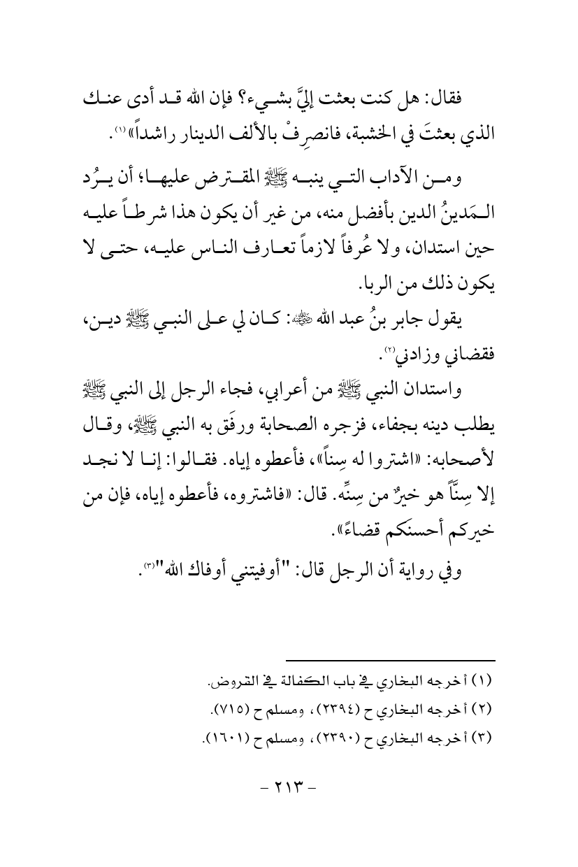 ومن الآداب التي ينبه - صلى الله عليه وسلم - المقترض عليها؛ أن يرُد المَدينُ الدين بأفضل منه، من غير أن يكون هذا شرطاً عليه حين استدان، ولا عُرفاً لازماً تعارف الناس عليه، حتى لا يكون ذلك من الربا.