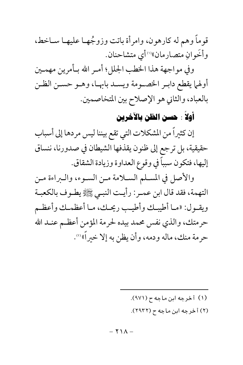 وفي مواجهة هذا الخطب الجلل؛ أمر الله بأمرين مهمين أولهما يقطع دابر الخصومة ويسد بابها، وهو حسن الظن بالعباد، والثاني هو الإصلاح بين المتخاصمين.