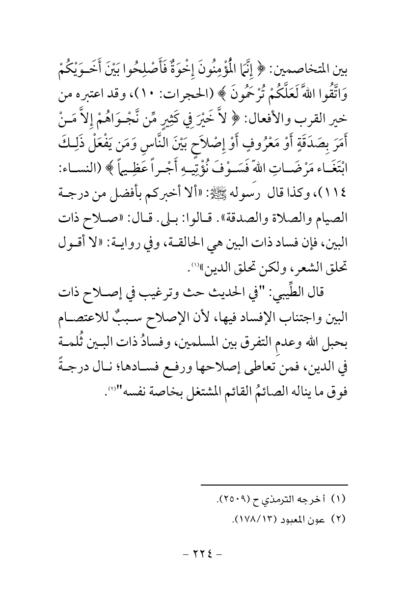 بين المتخاصمين: {إِنَّمَا الْمُؤْمِنُونَ إِخْوَةٌ فَأَصْلِحُوا بَيْنَ أَخَوَيْكُمْ وَاتَّقُوا اللَّهَ لَعَلَّكُمْ تُرْحَمُونَ} (الحجرات: 10)، وقد اعتبره من خير القرب والأفعال: {لاَّ خَيْرَ فِي كَثِيرٍ مِّن نَّجْوَاهُمْ إِلاَّ مَنْ أَمَرَ بِصَدَقَةٍ أَوْ مَعْرُوفٍ أَوْ إِصْلاَحٍ بَيْنَ النَّاسِ وَمَن يَفْعَلْ ذَلِكَ ابْتَغَاء مَرْضَاتِ اللهِ فَسَوْفَ نُؤْتِيهِ أَجْراً عَظِيماً} (النساء: 114)، وكذا قال رسوله - صلى الله عليه وسلم -: «ألا أخبركم بأفضل من درجة الصيام والصلاة والصدقة». قالوا: بلى. قال: «صلاح ذات البين، فإن فساد ذات البين هي الحالقة، وفي رواية: «لا أقول تحلق الشعر، ولكن تحلق الدين» (¬1).