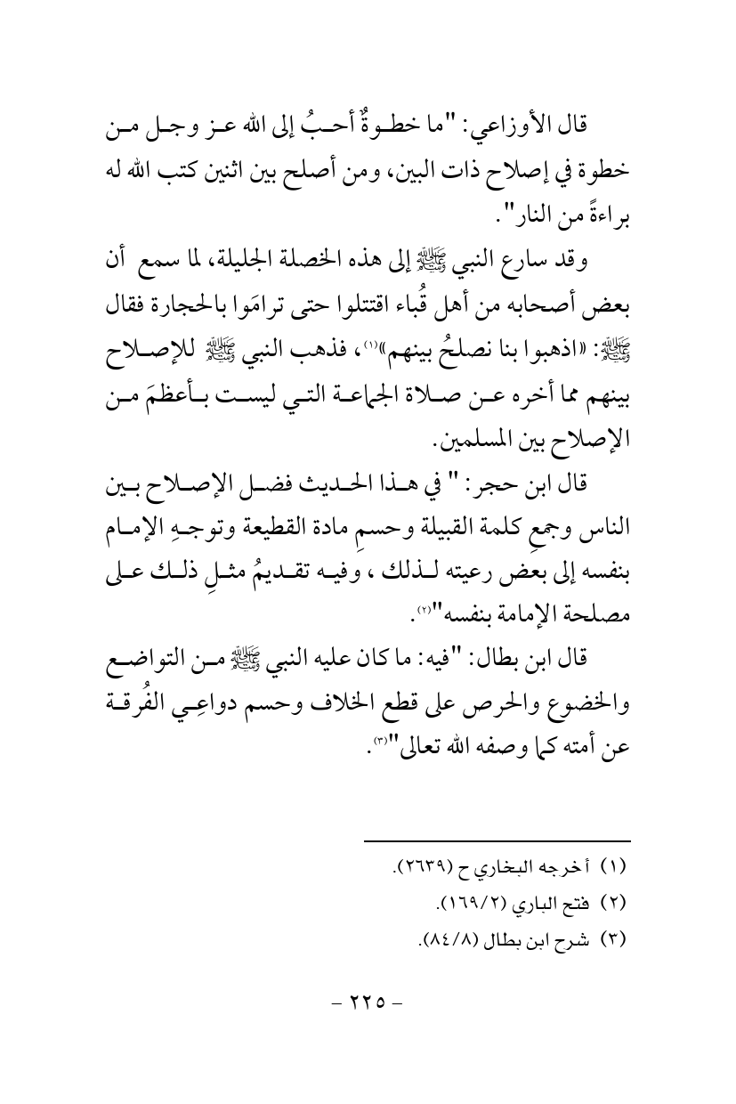 وقد سارع النبي - صلى الله عليه وسلم - إلى هذه الخصلة الجليلة، لما سمع أن بعض أصحابه من أهل قُباء اقتتلوا حتى ترامَوا بالحجارة فقال - صلى الله عليه وسلم -: «اذهبوا بنا نصلحُ بينهم» (¬1)، فذهب النبي - صلى الله عليه وسلم - للإصلاح بينهم مما أخره عن صلاة الجماعة التي ليست بأعظمَ من الإصلاح بين المسلمين.