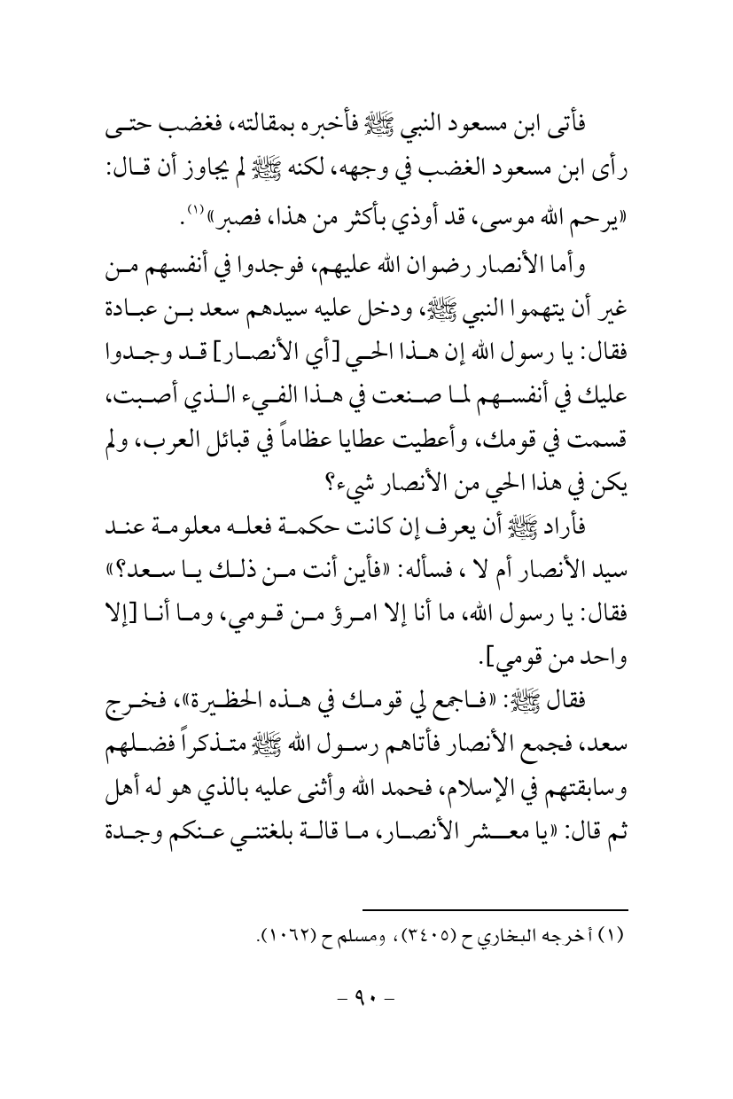 وأما الأنصار رضوان الله عليهم، فوجدوا في أنفسهم من غير أن يتهموا النبي - صلى الله عليه وسلم -، ودخل عليه سيدهم سعد بن عبادة فقال: يا رسول الله إن هذا الحي [أي الأنصار] قد وجدوا عليك في أنفسهم لما صنعت في هذا الفيء الذي أصبت، قسمت في قومك، وأعطيت عطايا عظاماً في قبائل العرب، ولم يكن في هذا الحي من الأنصار شيء؟