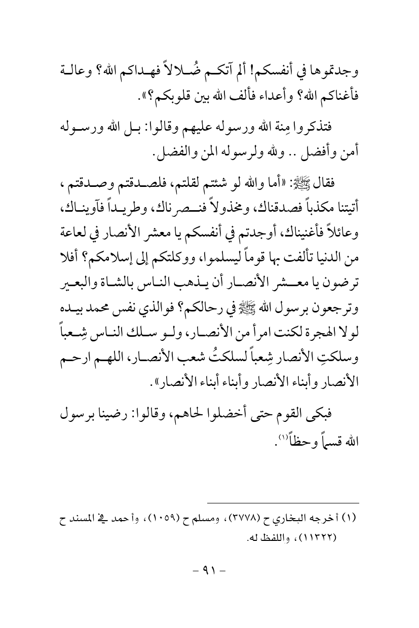 فقال - صلى الله عليه وسلم -: «أما والله لو شئتم لقلتم، فلصدقتم وصدقتم، أتيتنا مكذباً فصدقناك، ومخذولاً فنصرناك، وطريداً فآويناك، وعائلاً فأغنيناك، أوجدتم في أنفسكم يا معشر الأنصار في لعاعة من الدنيا تألفت بها قوماً ليسلموا، ووكلتكم إلى إسلامكم؟ أفلا ترضون يا معشر الأنصار أن يذهب الناس بالشاة والبعير وترجعون برسول الله - صلى الله عليه وسلم - في رحالكم؟ فوالذي نفس محمد بيده لولا الهجرة لكنت امرأ من الأنصار، ولو سلك الناس شِعباً وسلكتِ الأنصار شِعباً لسلكتُ شعب الأنصار، اللهم ارحم الأنصار وأبناء الأنصار وأبناء أبناء الأنصار».