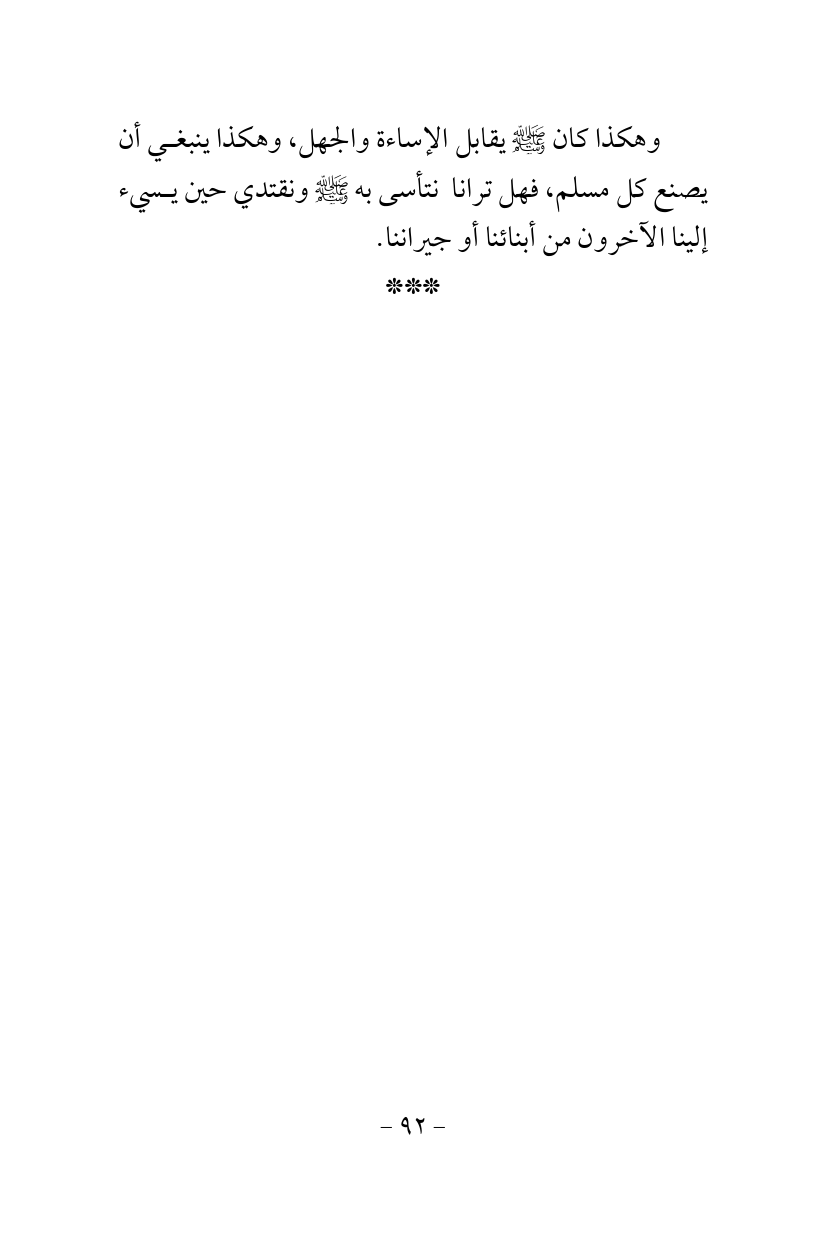 وهكذا كان - صلى الله عليه وسلم - يقابل الإساءة والجهل، وهكذا ينبغي أن يصنع كل مسلم، فهل ترانا نتأسى به - صلى الله عليه وسلم - ونقتدي حين يسيء إلينا الآخرون من أبنائنا أو جيراننا.