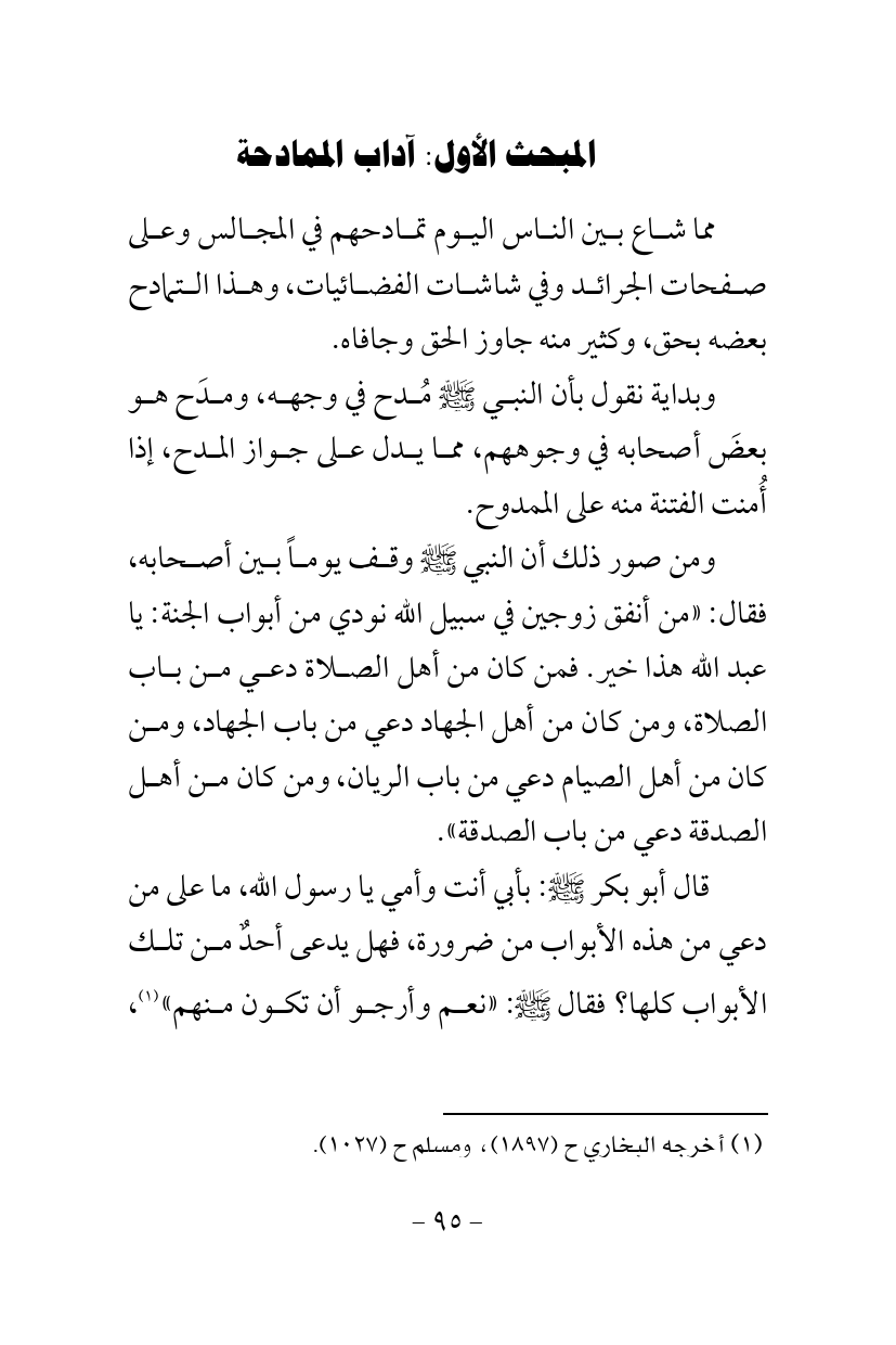 وبداية نقول بأن النبي - صلى الله عليه وسلم - مُدح في وجهه، ومدَح هو بعضَ أصحابه في وجوههم، مما يدل على جواز المدح، إذا أُمنت الفتنة منه على الممدوح.