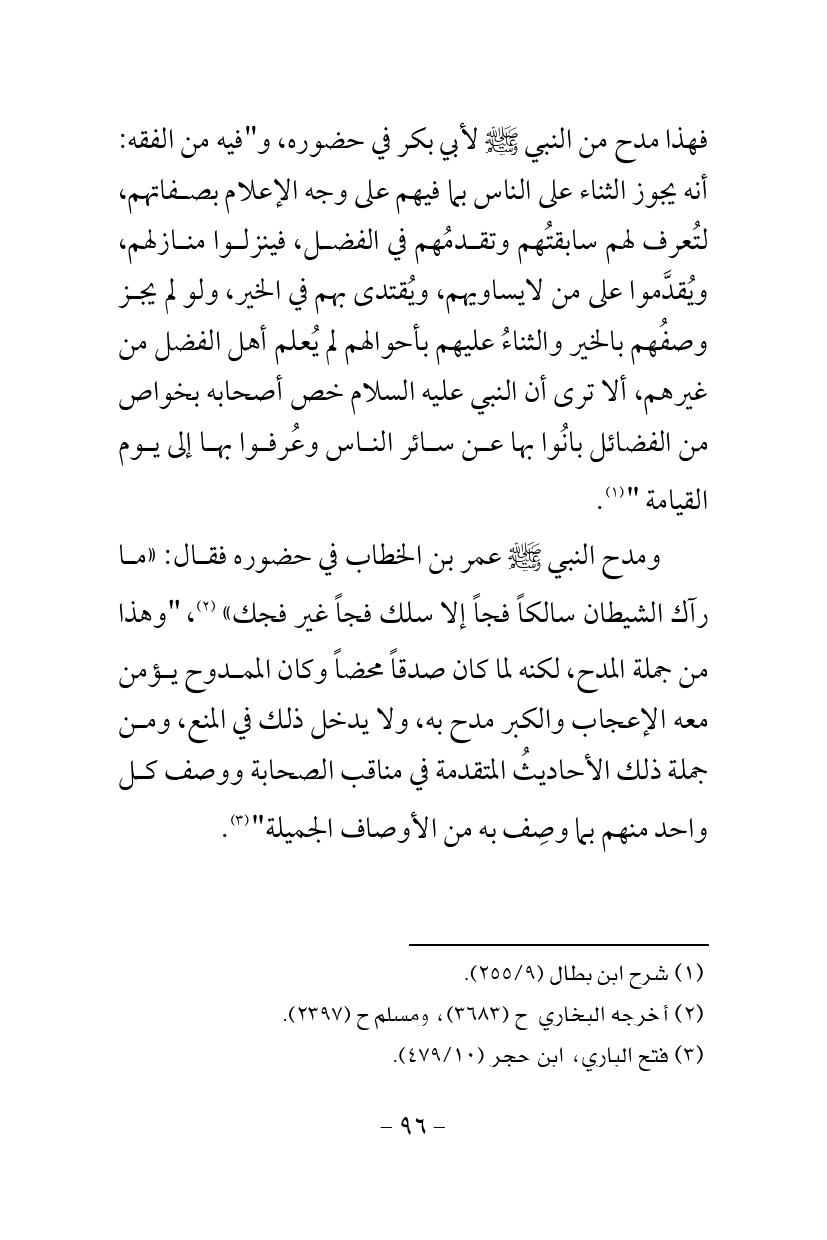 ومدح النبي - صلى الله عليه وسلم - عمر بن الخطاب في حضوره فقال: «ما رآك الشيطان سالكاً فجاً إلا سلك فجاً غير فجك» (¬2)، "وهذا من جملة المدح، لكنه لما كان صدقاً محضاً وكان الممدوح يؤمن معه الإعجاب والكبر مدح به، ولا يدخل ذلك في المنع، ومن جملة ذلك الأحاديثُ المتقدمة في مناقب الصحابة ووصف كل واحد منهم بما وصِف به من الأوصاف الجميلة" (¬3).