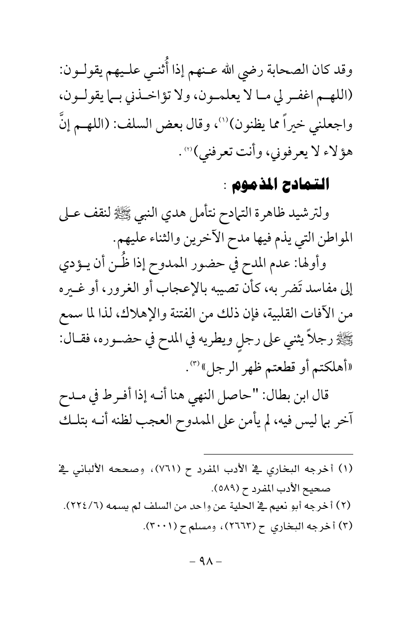 وأولها: عدم المدح في حضور الممدوح إذا ظُن أن يؤدي إلى مفاسد تَضر به، كأن تصيبه بالإعجاب أو الغرور، أو غيره من الآفات القلبية، فإن ذلك من الفتنة والإهلاك، لذا لما سمع - صلى الله عليه وسلم - رجلاً يثني على رجلٍ ويطريه في المدح في حضوره، فقال: «أهلكتم أو قطعتم ظهر الرجل» (¬3).