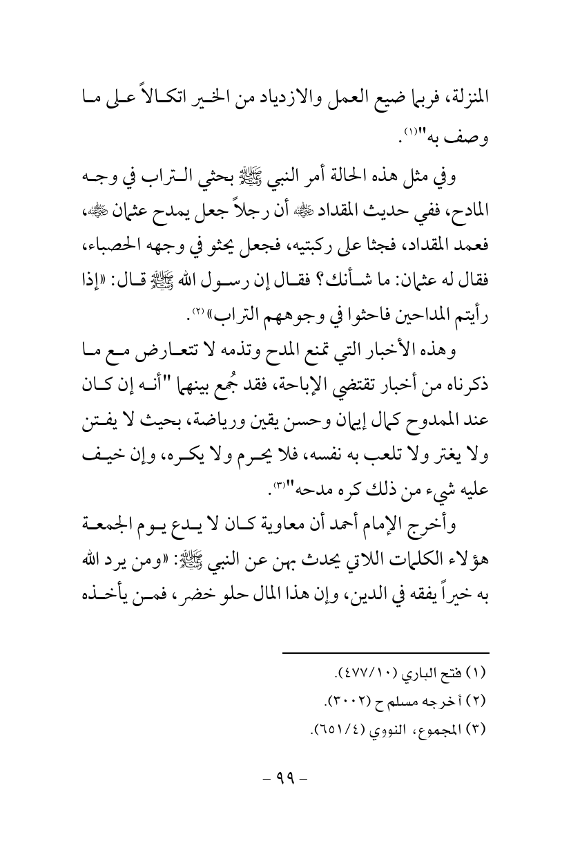 وهذه الأخبار التي تمنع المدح وتذمه لا تتعارض مع ما ذكرناه من أخبار تقتضي الإباحة، فقد جُمع بينهما "أنه إن كان عند الممدوح كمال إيمان وحسن يقين ورياضة، بحيث لا يفتن ولا يغتر ولا تلعب به نفسه، فلا يحرم ولا يكره، وإن خيف عليه شيء من ذلك كره مدحه" (¬3).