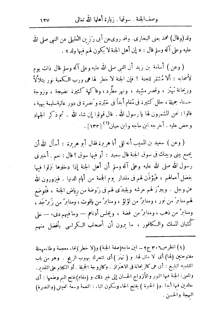 (وعن) سعيد بن المسيب أنه لقى أبا هريرة فقال أبو هريرة: أسأل الله أن يجمع بينى وبينك فى سوق الجنة قال سعيد: أو فيها سوق؟ قال: نعم. أخبرنى رسول الله صلى الله عليه وعلى آله وسلم أن أهل الجنة إذا دخلوها نزلوا فيها بفضل أعمالهم، فيؤذن لهم فى مقدار يوم الجمعة من أيام الدنيا. فيزورون الله عز وجل. ويبرز لهم عرشه ويتبدى لهم في روضة من رياض الجنة، فتوضع لهم نابر من نور، ومنابر من لؤلؤ، ومنابر من ياقوت، ومنابر من زبرجد، ومنابر من ذهب، ومنابر من فضة، ويجلس أدناهم- وما فيهم دنئ- على كثبان المسك والكافور، ما يرون أن أصحاب الكراسي بأفضل منهم