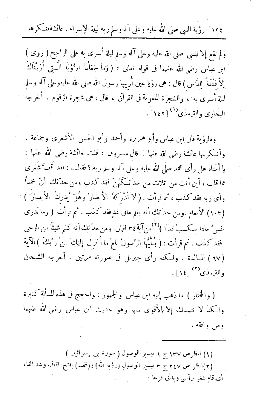 وبالرؤية قال ابن عباس وأبو هريرة وأحمد وأبو الحسن الأشعري وجماعة. وأنكرتها عائشة رضي الله عنها. قال مسروق: قلت لعائشة رضي الله عنها: يا أمتاه هل رأى محمد صلى الله عليه وعلى آله وسلم ربه؟ فقالت: لقد قف شعري مما قلت، أين أنت من ثلاث من حدثكهن فقد كذب، من حدثك أن محمدا رأى ربه فقد كذب، ثم قرأت: (لا تدركه الأبصار وهو يدرك الأبصار) {103} الأنعام. ومن حدثك أنه يعلم ما في غد فقد كذب. ثم قرأت (وما تدري نفس ماذا تكسب غدا) من آية (34) لقمان. ومن حدثك أنه كتم شيئا من الوحي فقد كذب. ثم قرأت: (يأيها الرسول بلغ ما أنزل إليك من ربك) (الآية 67 المائدة). ولكنه رأى جبريل في صورته مرتين. أخرجه الشيخان والترمذي (¬2) {14}.