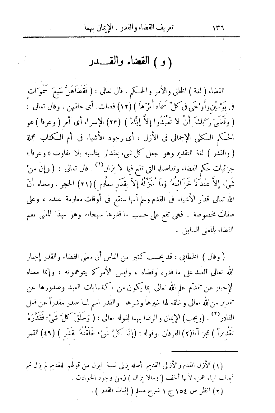 القضاء (لغة) الخلق والأمر والحكم. قال تعالى: "فقضاهن سبع سموات في يومين وأوحى في كل سماء أمرها" (12) فصلت. أي خلقهن. وقال تعالى: (وقضى ربك أن لا تعبدوا إلا إياه) (23) الإسراء أي أمر (وعرفا) هو الحكم الكلي الإجمالي في الأزل، أي وجود الأشياء في أم الكتاب مجملة (والقدر) لغة التقدير وهو جعل كل شيء بمقدار يناسبه بلا تفاوت "وعرفا" جزئيا حكم القضاء وتفاصيله التي تقع فيما لا يزال (¬1) قال تعالى: (وأن من شيء إلا عندنا خزائنه وما ننزله إلا بقدر معلوم) (21) الحجر. ومعناه أن الله تعالى قدر الأشياء في القدم وعلم أنها ستقع في أوقات معلومة عنده، وعلى صفات مخصوصة. فهي تقع على حسب ما قدرها سبحانه وهو بهذا المعنى يعم القضاء بالمعنى السابق.