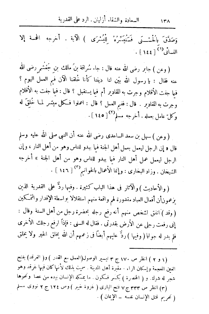 (والأحاديث) والآثار في هذا الباب كثيرة. وفيها رد على القدرية الذين يزعمون أن أفعال العباد مقدرة لهم واقعة منهم استقلالا بواسطة الأقدار والتمكين (وقد) اتفق لشخص منهم أنه رفع رجله بحضرة رجل من أهل السنة وقال: أني رفعت رجلي عن الأرض بقدرتي. فقال له السني: فإذا ارفع رجلك الأخرى فلم يدر له جوابا (وفيها) رد عليهم أيضا في زعمهم أن الله يخلق الخير ولا يخلق