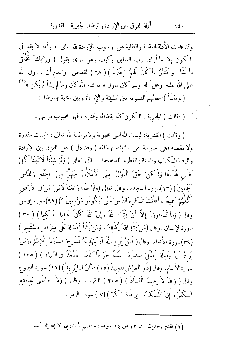 (وقالت) القدرية: ليست المعاصي محبوبة ولا مرضية الله تعالى، فليست مقدرة ولا مقضية فهي خارجة عن مشيئته وخلقه (وقد دل) على الفرق بين الإرادة والرضا الكتاب والسنة والفطرة الصحيحة. قال تعالى (ولو شئنا لآتينا كل نفس هداها ولكن حق القول مني لأملأن جهنم من الجنة والناس أجمعين) (13) سورة السجدة. وقال تعالى (ولو شاء ربك لآمن من في الأرض كلهم جميعا، أفأنت تكره الناس حتى يكونوا مؤمنين؟ ) (99) سورة يونس وقال (وما تشاءون إلا أن يشاء الله، إن الله كان عليما حكيما) (30) سورة الإنسان. وقال (من يشاء) (الله يضلله، ومن يشأ يجعله على صراط مستقيم) (39) سورة الأنعام. وقال (فمن يرد الله أن يهديه يشرح صدره للإسلام، ومن يردن أن يضله يجعل صدره ضيقا حرجا كأنما يصعد في السماء) (125) سورة الأنعام. وقال (ذو العرش المجيد (15) (فعال لما يريد) (16) سورة البروج وقال (والله لا يحب الفساد) (205) البقرة. وقال (ولا يرضى لعباده الكفر وإن تشكروا يرضه لكم) (7) سورة الزمر.