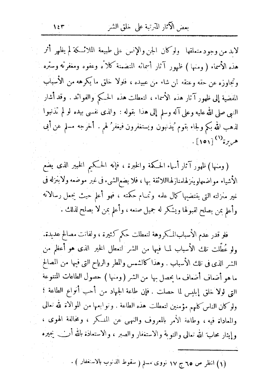 لابد من وجود متعلقها ولو كان الجن والأنس على طبيعة الملائكة لم يظهر أثر هذه الأسماء (ومنها) ظهور آثار أسمائه المتضمنة كلأه وعفوه ومغفرته وستره وتجاوزه عن حقه وعتقه لمن شاء من عبيده، فلولا خلق ما يكرهه من الأسباب المفضية إلى ظهور آثار هذه الأسماء، لتعطلت هذه الحكم والفوائد. وقد أشار النبي صلى الله عليه وعلى آله وسلم إلى هذا بقوله: والذي نفسي بيده لو لم تذنبوا لذهب الله بكم ولجاء بقوم يذنبون ويستغفرون فيغفر لهم. أخرجه مسلم عن الأسباب المفضية على ظهور آثار هذه الأسماء، لتعطلت هذه الحكم والفوائد. وقد أشار النبي صلى الله عليه وعلى آله وسلم إلى هذا بقوله: والذي نفسي بيده لو لم تذنبوا لذهب الله بكم ولجاء بقوم يذنبون ويستغفرون فيغفر لهم. أخرجه مسلم عن أبي هريرة (¬1) {151}.
