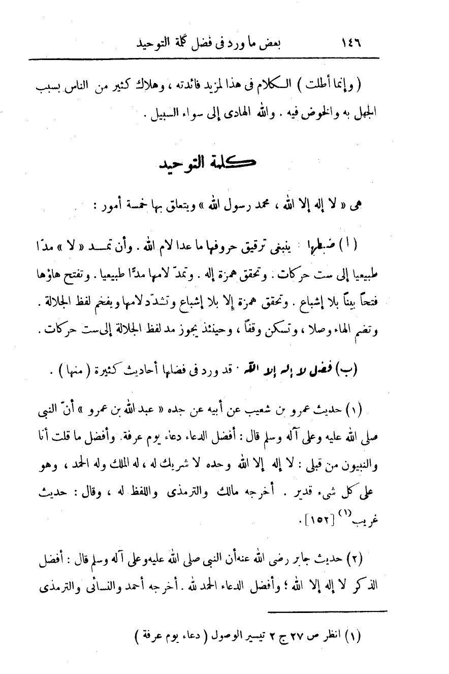 1 - حديث عمرو بن شعيب عن أبيه عن جده "عبد الله بن عمرو" أن النبي صلى الله عليه وعلى آله وسلم قال: أفضل الدعاء دعاء يوم عرفة. وأفضل ما قلت أنا والنبيون من قبلي: لا إله إلا الله وحده لا شريك له، له الملك وله الحمد، وهو على كل شيء قدير. أخرجه مالك والتعرمذي واللفظ له، وقال: حديث غريب (¬1) {152}.