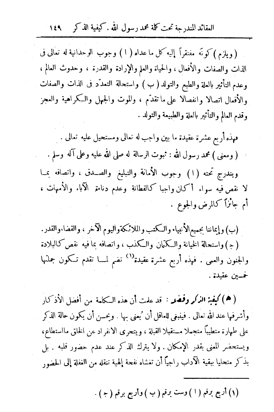 (جـ) واستحالة الخيانة والكتمان والكذب، واتصافه بما فيه نقص كالبلادة والجنون والعمى، فهذه أربع عشرة عقيدة (¬1) تضم لما تقدم تكون جملتها خمسين عقيدة.