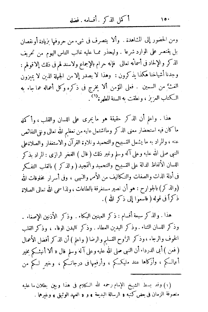 هذا والذكر سبعة أقسام: ذكر العينين البكاء. وذكر الأذنين الاصغاء. وذكر اللسان الثناء. وذكر اليدين العطاء. وذكر البدن الوفاء، وذكر القلب الخوف والرجاء، وذكر الروح التسليم والرضا (واعلم) أن الذكر أفضل الأعمال (فعن) أبى الدرداء أن النبى صلى الله عليه وسلم قال" ألا أنبئكم بخير أعمالكم، وأذكارها عند مليككم، وأرفعها فى درجاتكم، وخير لكم من