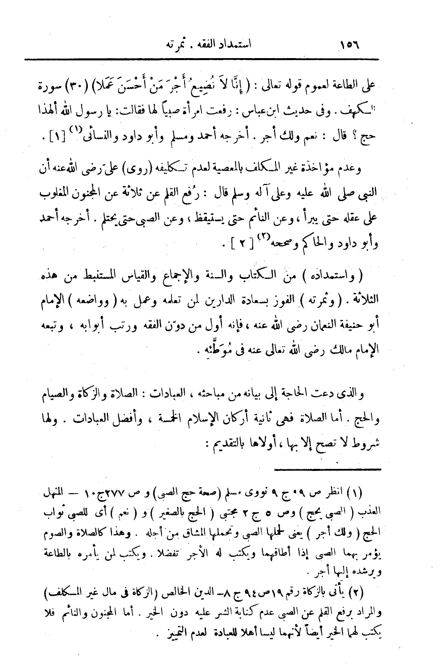 (¬2) يأتى بالزكاة رقم 19 ص 94 ج 8 - الدين الخالص (الزكاة فى مال غير المكلف) والمراد برفع القلم عن الصبى عدم كتابة الشر عليه دون الخير. أما المجنون والنائم فلا يكتب لهما. الخير ايضا لأنهما ليسا أهلا للعبادة لعدم التمييز.
