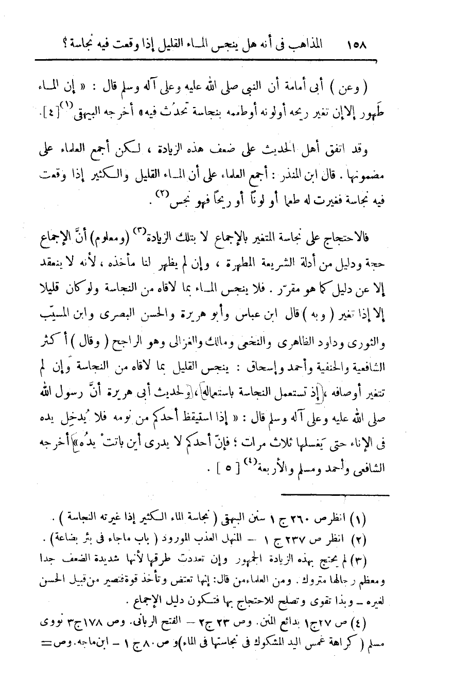 فالاحتجاج على نجاسة المتغير بالإجماع لا بتلك الزيادة (¬3) (ومعلوم) أن الإجماع حجة ودليل من أدلة الشريعة المطهرة، وإن لم يظهر لنا مأخذه، لأنه لا ينعقد إلا عن دليل كما هو مقرر. فلا ينجس الماء بما لا قاه من النجاسة ولو كان قليلا إلا إذا تغير (وبه) قال ابن عباس وأبو هريرة والحسن البصرى وابن المسيب والثورى وداود الظاهرى والنخعى ومالك والغزالى وهو الراجح (وقال) أكثر الشافعية والحنفية وأحمد وإسحاق: ينجس القليل بما لاقاه من النجاسة وإن لم تتغر أوصافه، إذ تستعمل النجاسة باستعماله، ولحديث أبى هريرة أن رسول الله صلى الله عليه وعلى آله وسلم قال: " إذا استيقظ أحدكم من نومه فلا يدخل يده فى الإناء حتى يغسلها ثلاث مرات، فإن أحدكم لا يدرى أين باتت يده " أخرجه الشافعى وأمد ومسلم والأربعة (¬4) [5].