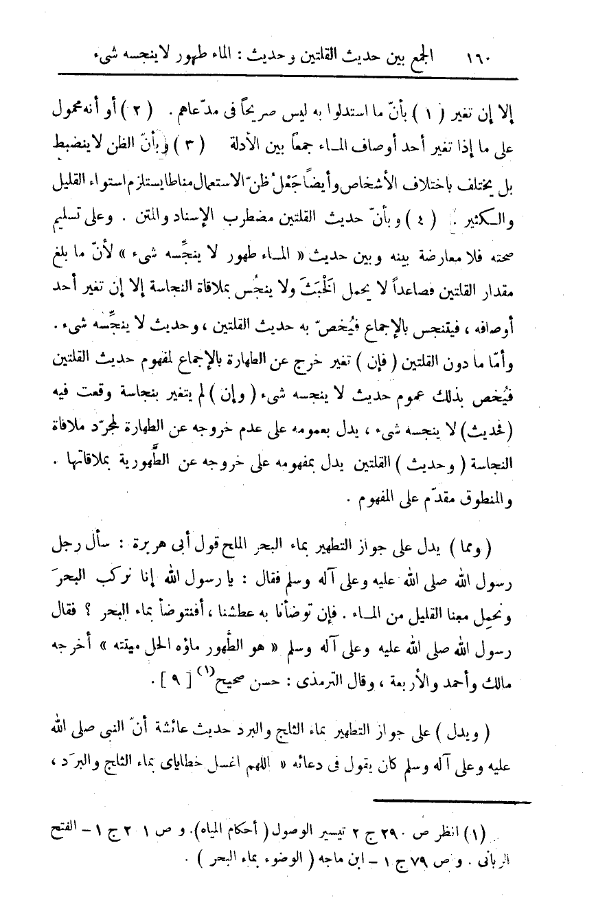 إلا أن تغير (1) بأن ما استدلوا به ليس صريحا فى مدعاهم. (2) أو أنه محمول على ما إذا تغير أحد أوصاف الماء جمعا بين الأدلة (3) وبأن الظن لا ينضبط بل يختلف باختلاف الأشخاص وايضا جعل ظن الاستعمال مناطا يستلزم استواء القليل والكثير. (4) وبأن حديث القلتين مضطرب الإسناد والمتن. وعلى تسليم صحته فلا معارضة بينه وبين حديث " الماء طهور لا ينجسه شئ" لأن ما بلغ مقدار القلتين فصاعدا لا يحمل الخبث ولا ينجس بملاقاة النجاسة إلا أن تغير أحد أوصافه، فيتنجس بالاجماع فيخص به حديث القلتين، وحديث لا ينجسه شئ. وأما ما دون القلتين (فإن) تغير خرج عن الطهارة بالاجماع لمفهوم حديث القلتين فيخص بذلك عموم حديث لا ينجسه شئ (وإن) لم يتغير بنجاسة وقعت فيه (فحديث) لا ينجسه شئ، يدل بعمومه على عدم خروجه عن الطهارة لمجرد ملاقاة النجاسة (وحديث) القلتين يدل بمفهومه على خروجه عن الطهورية بملاقاتها. والمنطوق مقدم على المفهوم.