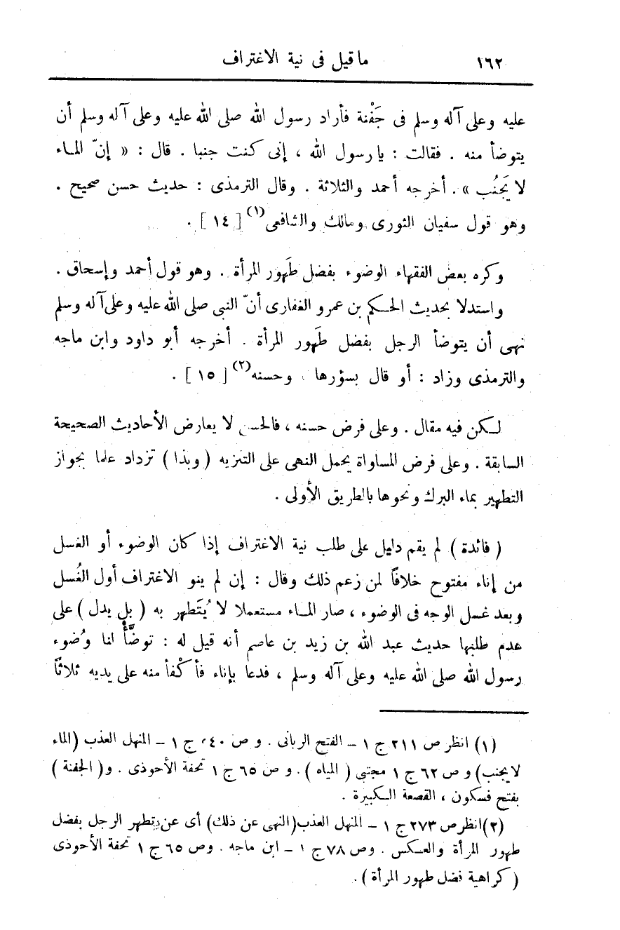 (¬2) انظر ص 273 ج 1 - المنهل العذب (النهى عن ذلك) أى عن تطهر الرجل بفضل طهور المرأة والعكس. وص 78 ج 1 - ابن ماجه. وص 65 ج 1 تحفة الأحوذى (كراهية فضل طهور المرأة).