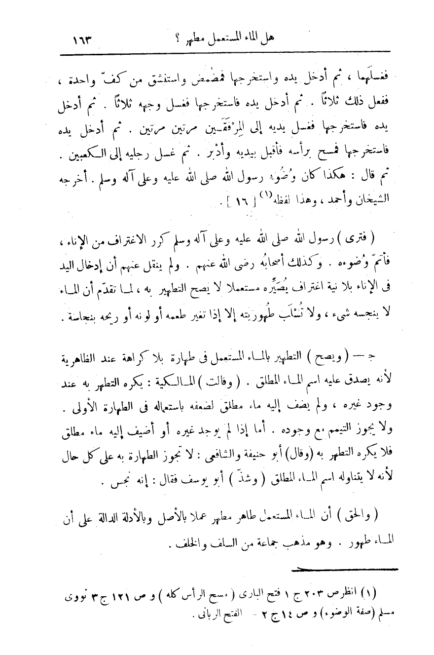(فترى) رسول الله صلى الله عليه وعلى آله وسلم كرر الاغتراف من الإناء، فأتم وضوءه. وكذلك أصحابه رضى الله عنهم. ولم ينقل عنهم أن إدخال اليد فى الإناء بلا نية اغتراف يصيره مستعملا لا يصح التطهير به، لما تقدم أن الماء لا ينجسه شئ، ولا تسلب طهورته إلا إذا تغير طعمه أو لونه أو ريحه بنجاسة.
