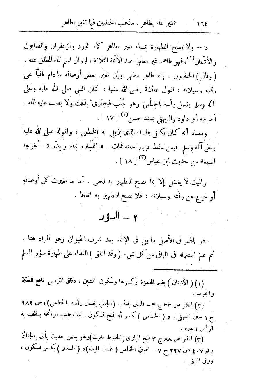 د - ولا تصح الطهارة بما تغير بطاهر كماء الورد والزعفران والصابون والأشنان (¬1)، فهو طاهر غير مطهر عند الأئمة الثلاثة، لزوال اسم الماء المطلق عنه. (وقال) الحنفيون: انه طاهر مطهر وان تغير بعض أوصافه ما دام باقيا على رقته وسيلانه، لقول عائشة رضى الله قعنها: كان النبى صلى الله عليه وعلى آله وسلم يغسل رأسه بالخطمى وهو جنب فيجتزئ بذلك ولا يصب عليه الماء أخرجه أبو داود والبيقهى بسند حسن (¬2) [17].