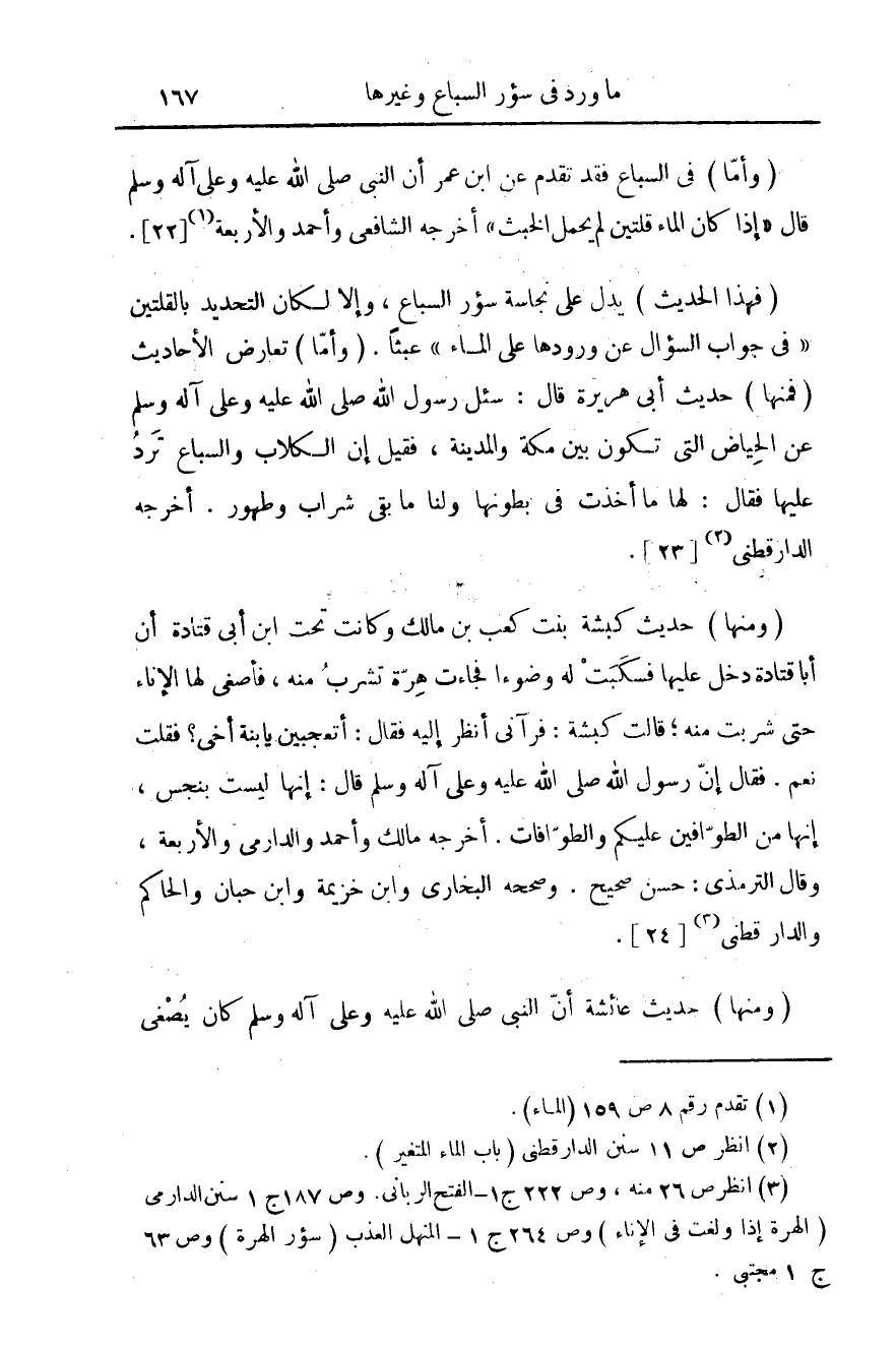 (¬3) انظر ص 26 منه، وص 222 ج 1 - الفتح الربانى. وص 187 ج 1 سنن الدرامى (الهرة اذا ولغت فى الاناء) وص 264 ج 1 - المنهل العذب (سؤر الهرة) وص 63 ج 1 مجتبى.
