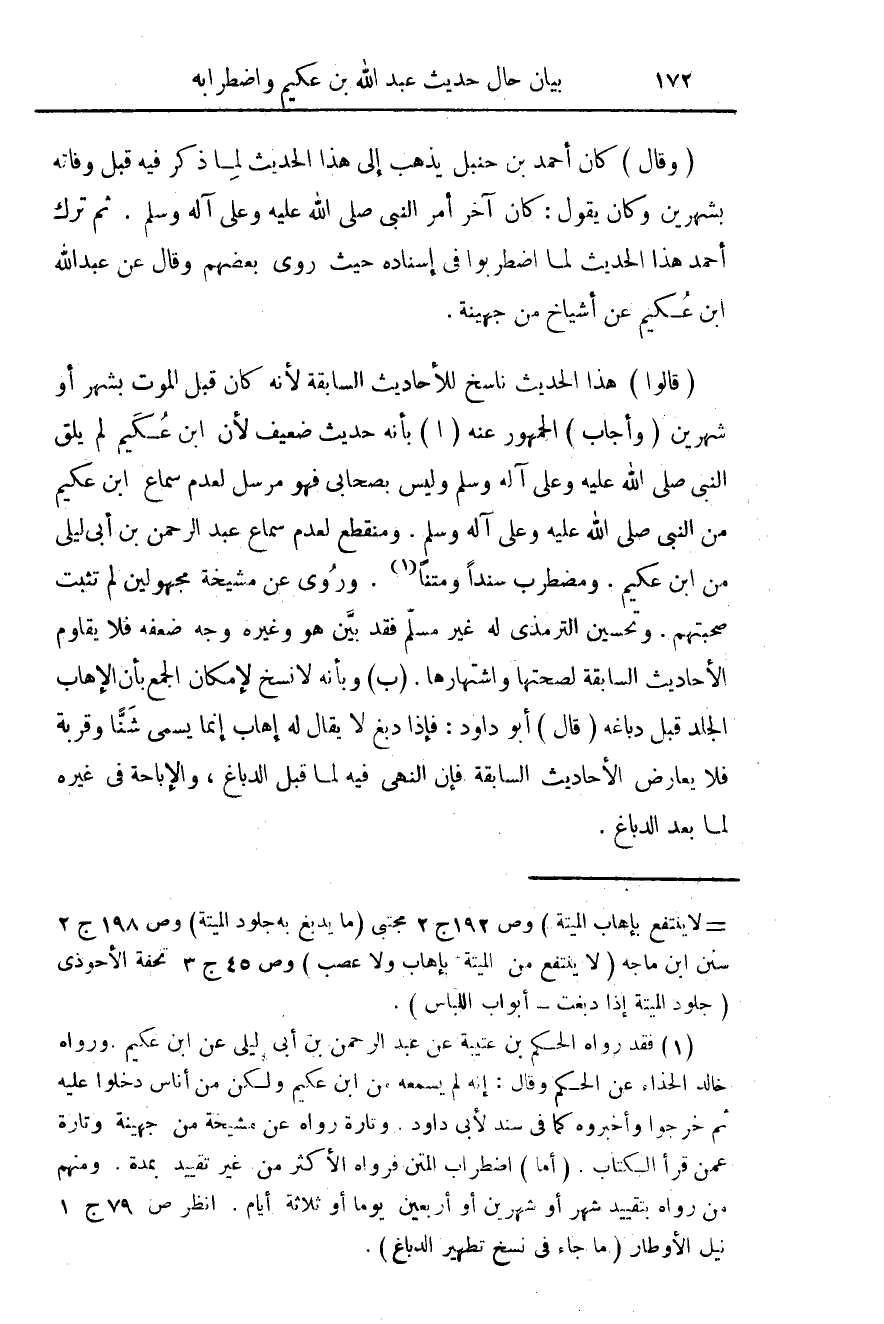 (¬1) فقد رواه الحكم بن عتيبة عن عبد الرحمن بن أبي ليلى عن ابن عكيم. ورواه خالد الحذاء عن الحكم وقال: أنه لم يسمعه من ابن عكيم ولكن من أناس دخلوا عليه ثم خرجوا وأخبروه كما في سند لأبي داود. وتارة رواه عن مشيخة من جهينة وتارة عمن قرأ الكتاب. (أما) اضطراب المتن فرواه الأكثر من غير تقييد بمدة. ومنهم من رواه بتقييد شهر أو شهرين أو أربعين يوما أو ثلاثة أيام. أنظر ص 79 ج 1 نيل الأوطار (ما جاء في نسخ تطهير الدباغ).