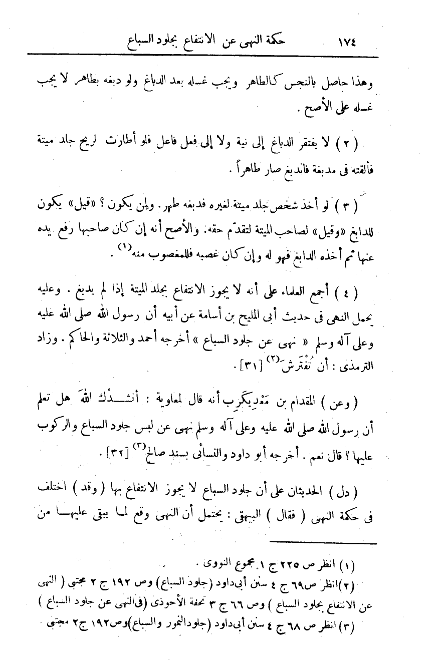 (¬2) انظر ص 69 ج 4 سنن أبي داود (جلود السباع) وص 192 ج 2 مجتبي (النهي عن الانتفاع بجلود السباع) وص 66 ج 3 تحفة الأحوذي (في النهي عن جلود السباع).